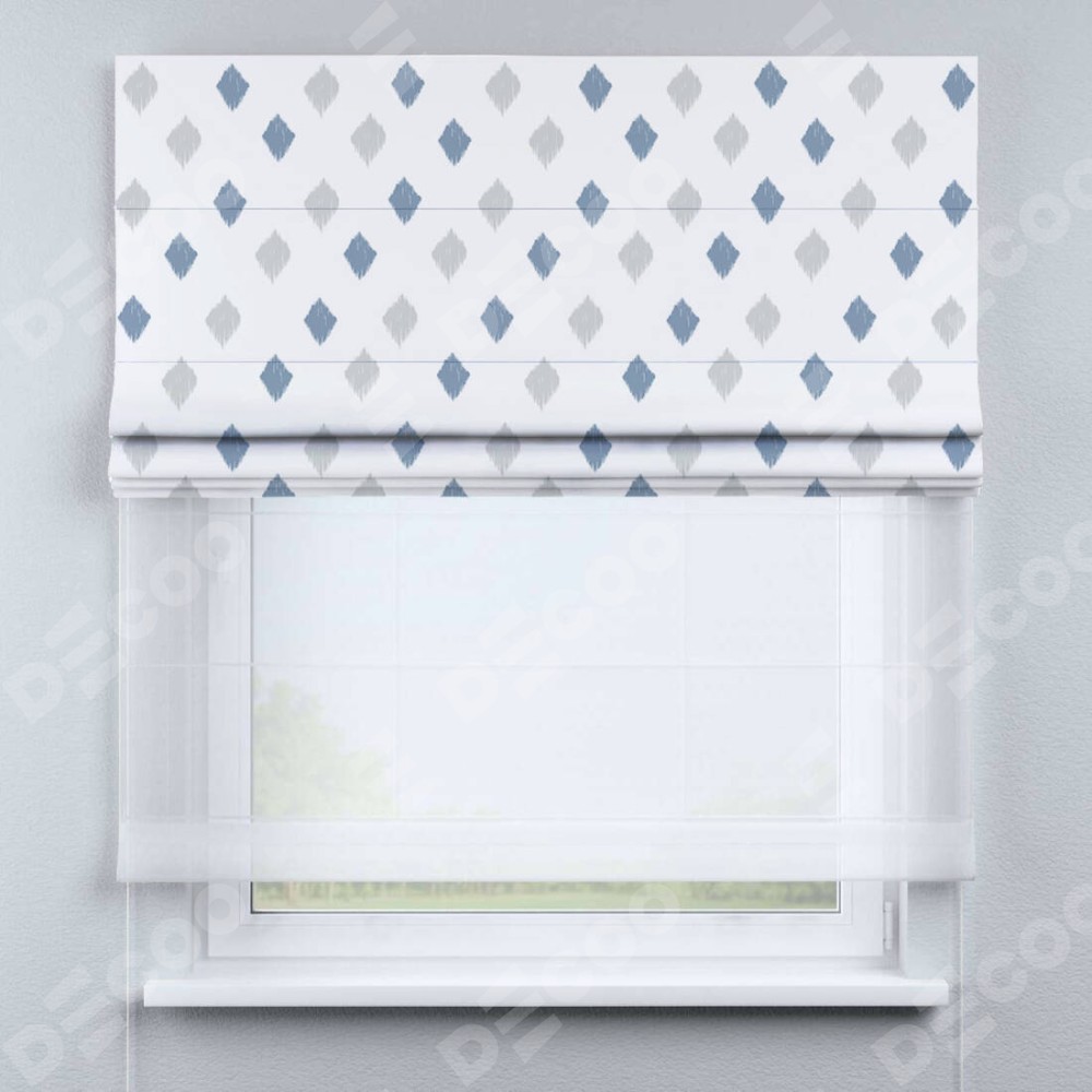 Двойная римская штора «День-ночь» от производителя Cortin предназначена для использования в проёмах. Эта штора уникальна тем, что состоит из двух полотен. На лицевой стороне находится блэкаут с нанесением сублимационной печати «Икат ромбики», обеспечивающий эффективное затемнение. В комплект также входит вторая ткань — легкий белый тюль (артикул: V-01), который добавляет изящества и легкости оформлению окна. Кроме того, доступны и другие разновидности ткани тюль, выбор которых доступен по ссылке .