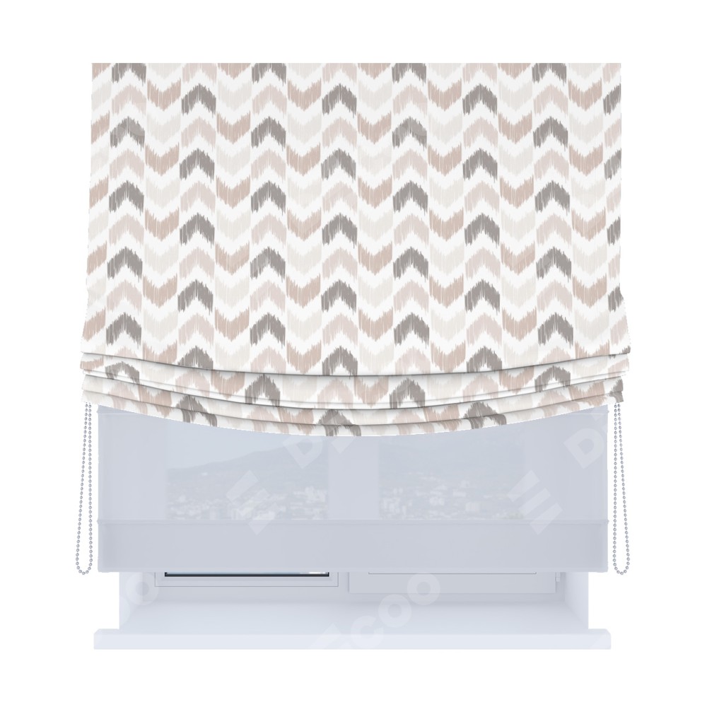 Римская штора день-ночь производителя «Cortin», используется для проёма, пошита из двух полотен, с лицевой блэкаут с нанесением сублимационной печати «Икат стрелки», вторая ткань тюль (по стандарту комплектуется тюль белого цвета артикул V-01). Имеет универсальный механизм и подходит для монтажа: на потолок, на стену и в нишу. Удобное управление каждой шторой отдельно.