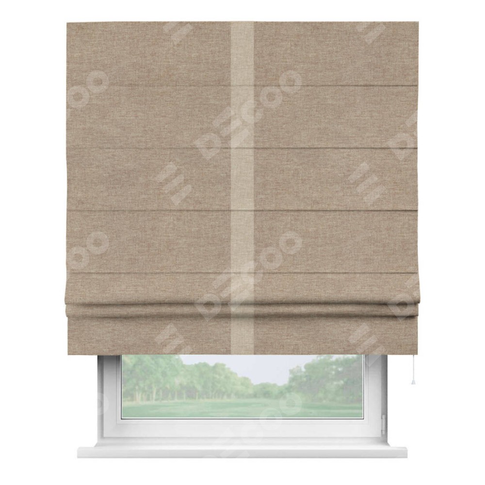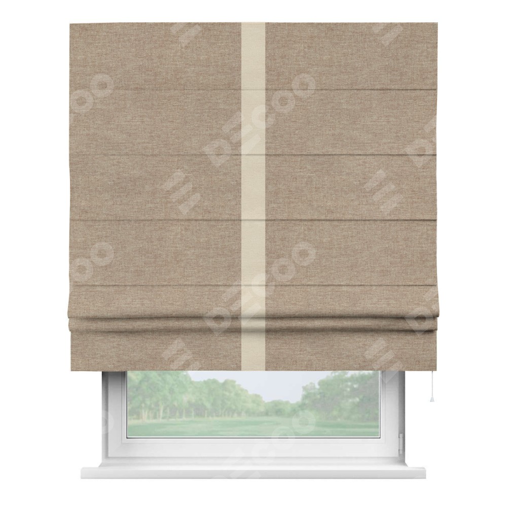Римская штора производителя «Cortin», используется для проёма, пошита из ткани лён кашемир коричневый, артикул 21614. Отделка шторы кантом «Хайвэй», ткань для канта используется из льна разной расцветки на выбор. Имеет универсальный механизм и подходит для монтажа: на потолок, на стену и в нишу.