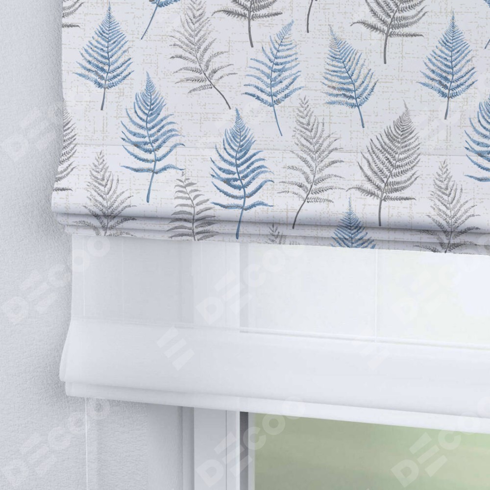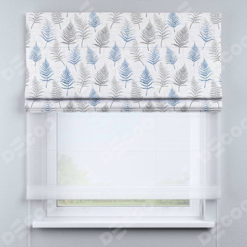 Двойная римская штора «День-ночь» от производителя Cortin предназначена для использования в проёмах. Эта штора уникальна тем, что состоит из двух полотен. На лицевой стороне находится блэкаут с нанесением сублимационной печати «Королевский папоротник», обеспечивающий эффективное затемнение. В комплект также входит вторая ткань — легкий белый тюль (артикул: V-01), который добавляет изящества и легкости оформлению окна. Кроме того, доступны и другие разновидности ткани тюль, выбор которых доступен по ссылке .