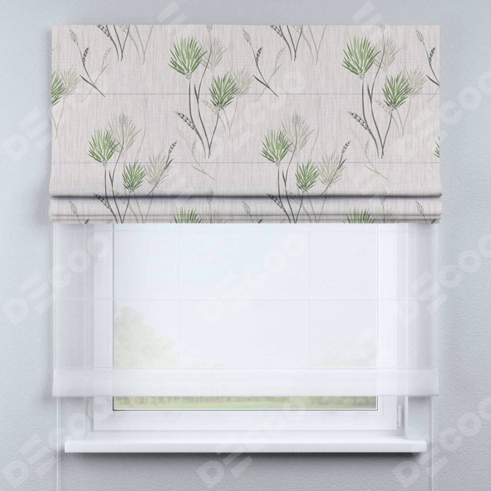 Двойная римская штора «День-ночь» от производителя Cortin предназначена для использования в проёмах. Эта штора уникальна тем, что состоит из двух полотен. На лицевой стороне находится блэкаут с нанесением сублимационной печати «Полевые травы бежевый», обеспечивающий эффективное затемнение. В комплект также входит вторая ткань — легкий белый тюль (артикул: V-01), который добавляет изящества и легкости оформлению окна. Кроме того, доступны и другие разновидности ткани тюль, выбор которых доступен по ссылке .