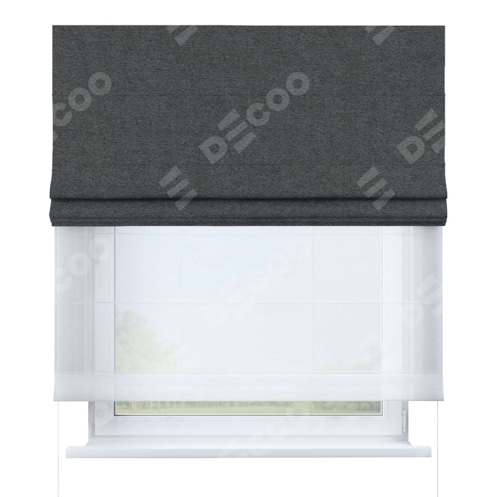 Двойная римская штора «День-ночь» от производителя Cortin предназначена для использования в проёмах. Эта штора уникальна тем, что состоит из двух полотен. На лицевой стороне находится твид блэкаут тёмно-серый (артикул: 90938), обеспечивающий эффективное затемнение. В комплект также входит вторая ткань — легкий белый тюль (артикул: V-01), который добавляет изящества и легкости оформлению окна. Кроме того, доступны и другие разновидности ткани тюль, выбор которых доступен по ссылке .