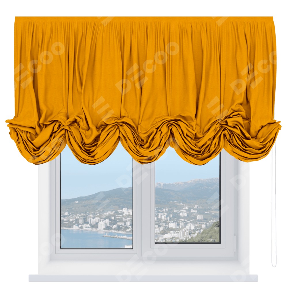 Австрийская штора производителя «Cortin», используется для проёма, пошита из ткани вельвет желтый, артикул ткани 85547. Имеет универсальный механизм и подходит для монтажа: на потолок и на стену.
