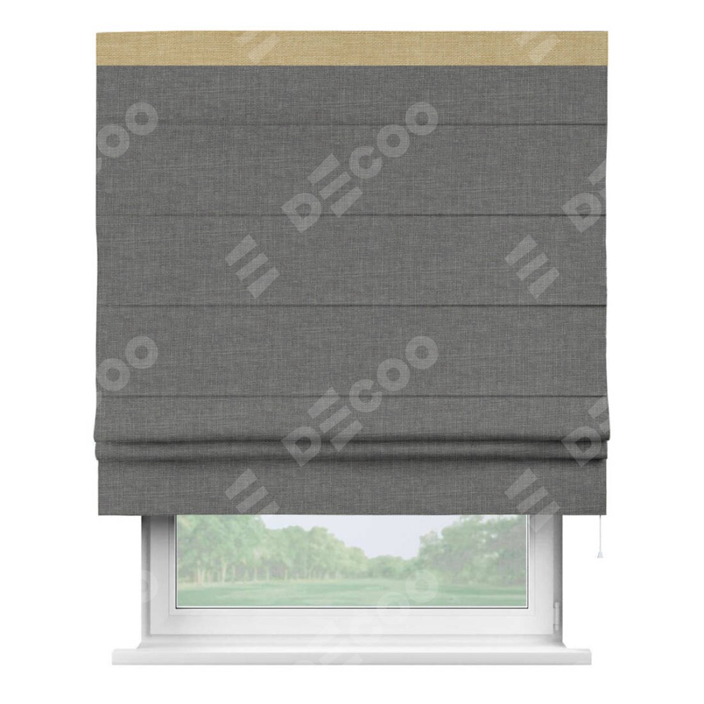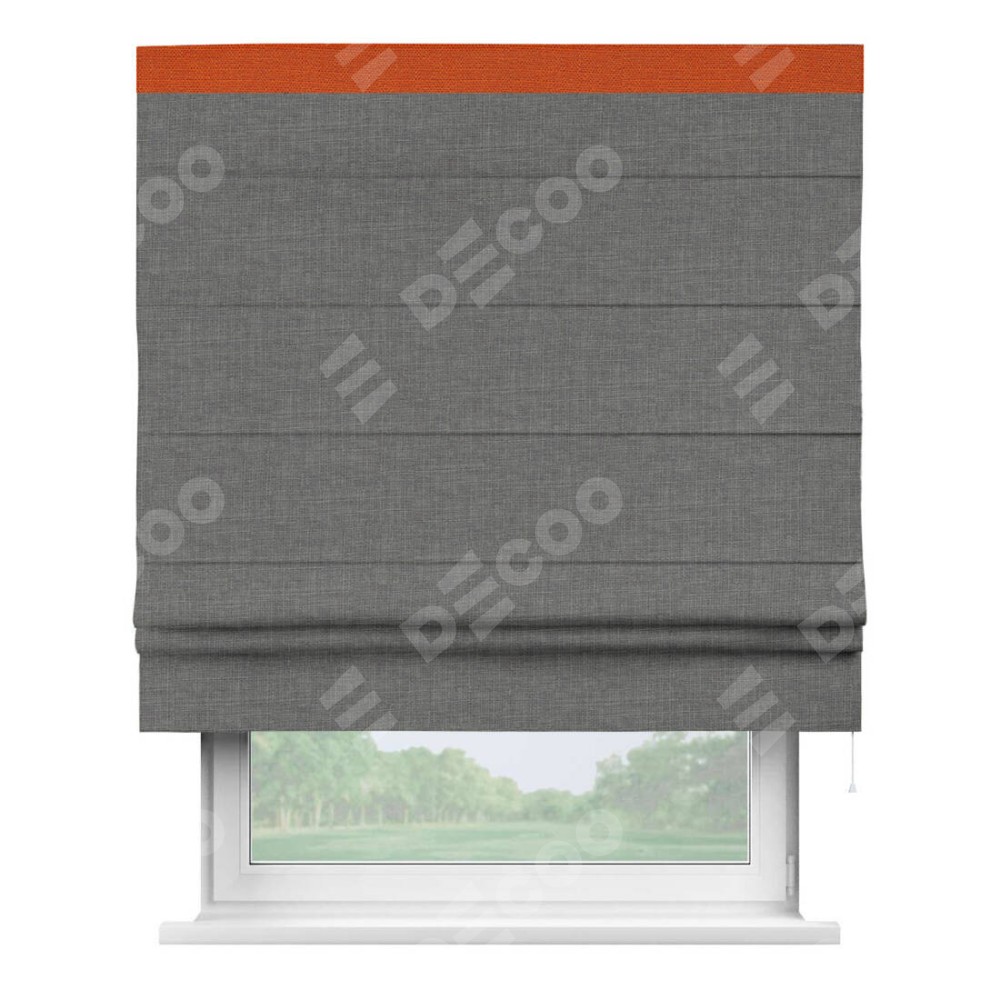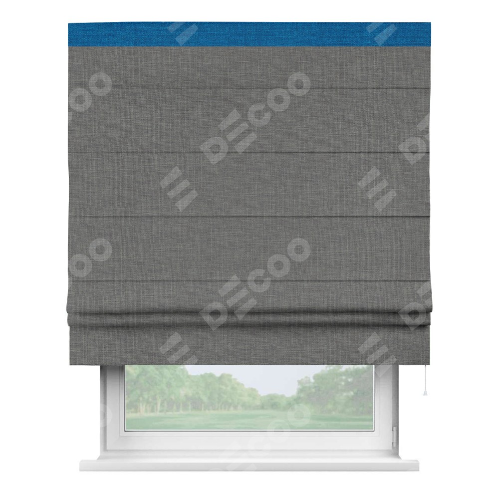 Римская штора производителя «Cortin», используется для проёма, пошита из ткани лён тёмно-серый, артикул 7441. Отделка шторы кантом «Кинг», ткань для канта используется из льна разной расцветки на выбор. Имеет универсальный механизм и подходит для монтажа: на потолок, на стену и в нишу.