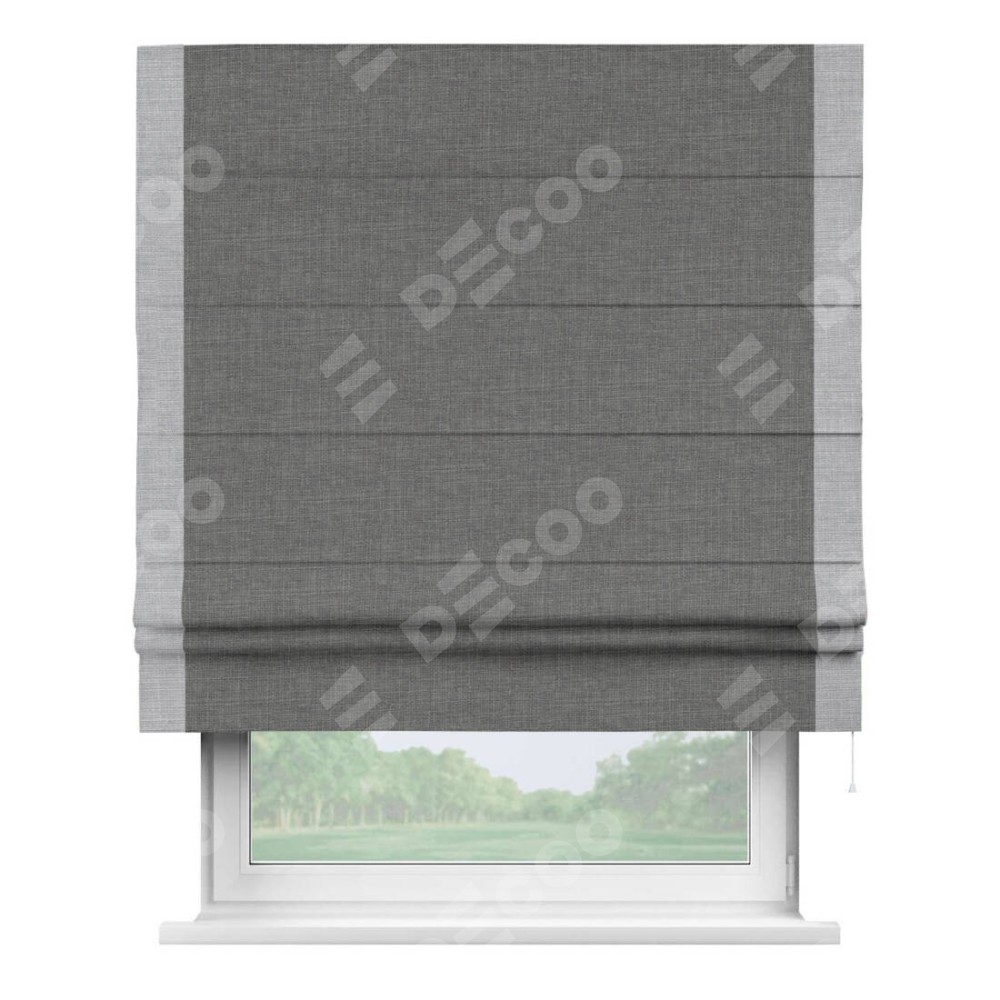 Римская штора производителя «Cortin», используется для проёма, пошита из ткани лён тёмно-серый, артикул 7441. Отделка шторы кантом «Стрим Дуо», ткань для канта используется из льна разной расцветки на выбор. Имеет универсальный механизм и подходит для монтажа: на потолок, на стену и в нишу.