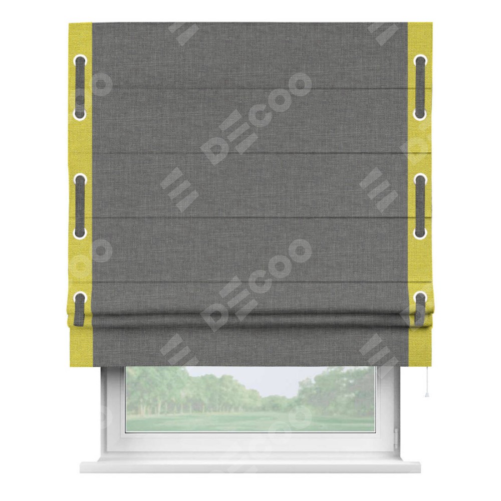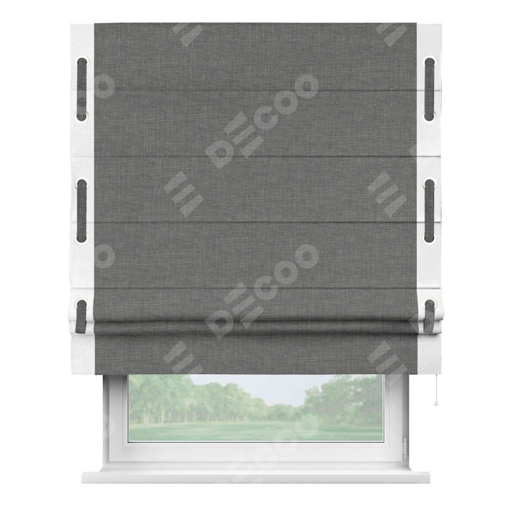 Римская штора производителя «Cortin», используется для проёма, пошита из ткани лён тёмно-серый, артикул 7441. Отделка шторы кантом «Стрим Дуо» на кантах расположены люверсы с пояском, ткань для канта используется из льна разной расцветки на выбор. Ткань для пояска обычно используется из основной ткани шторы, а так же можно сделать из любой расцветки по желанию. Имеет универсальный механизм и подходит для монтажа: на потолок, на стену и в нишу.