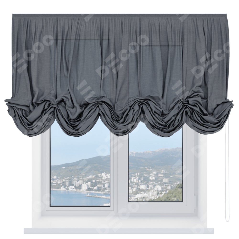 Австрийская штора производителя «Cortin», используется для проёма, пошита из ткани лён тёмно-серый, артикул ткани 7441. Имеет универсальный механизм и подходит для монтажа: на потолок и на стену.