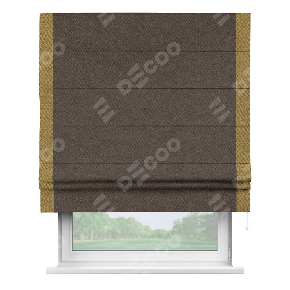 Римская штора производителя «Cortin», используется для проёма, пошита из ткани твид блэкаут тёмно-коричневый, артикул 90933. Отделка шторы кантом «Стрим Дуо», ткань для канта используется из твида разной расцветки на выбор. Имеет универсальный механизм и подходит для монтажа: на потолок, на стену и в нишу.
