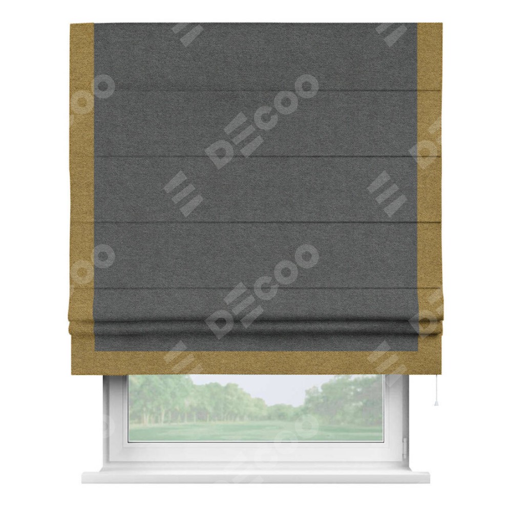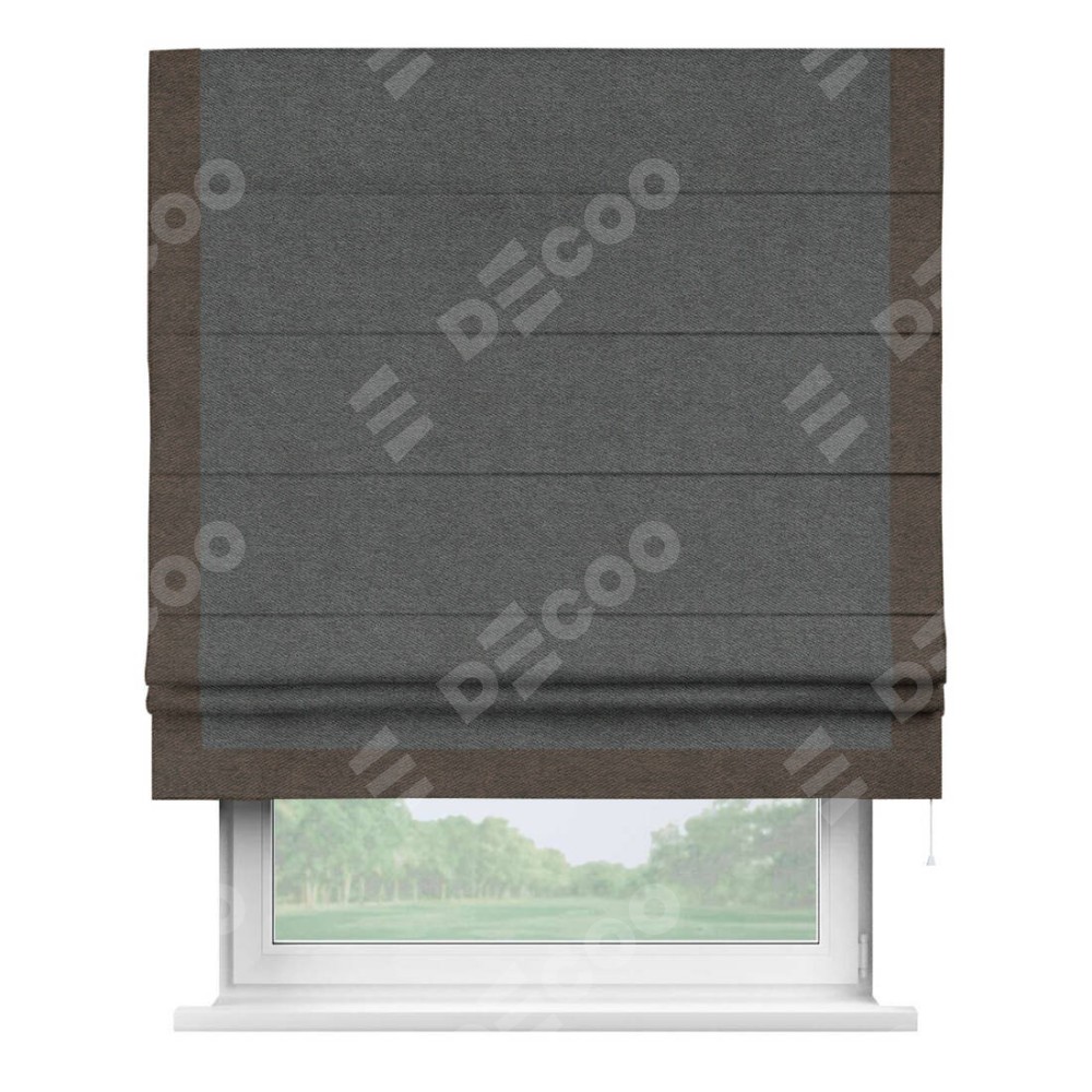 Римская штора производителя «Cortin», используется для проёма, пошита из ткани твид блэкаут тёмно-серый, артикул 90938. Отделка шторы кантом «Виктория», ткань для канта используется из твида разной расцветки на выбор. Имеет универсальный механизм и подходит для монтажа: на потолок, на стену и в нишу.