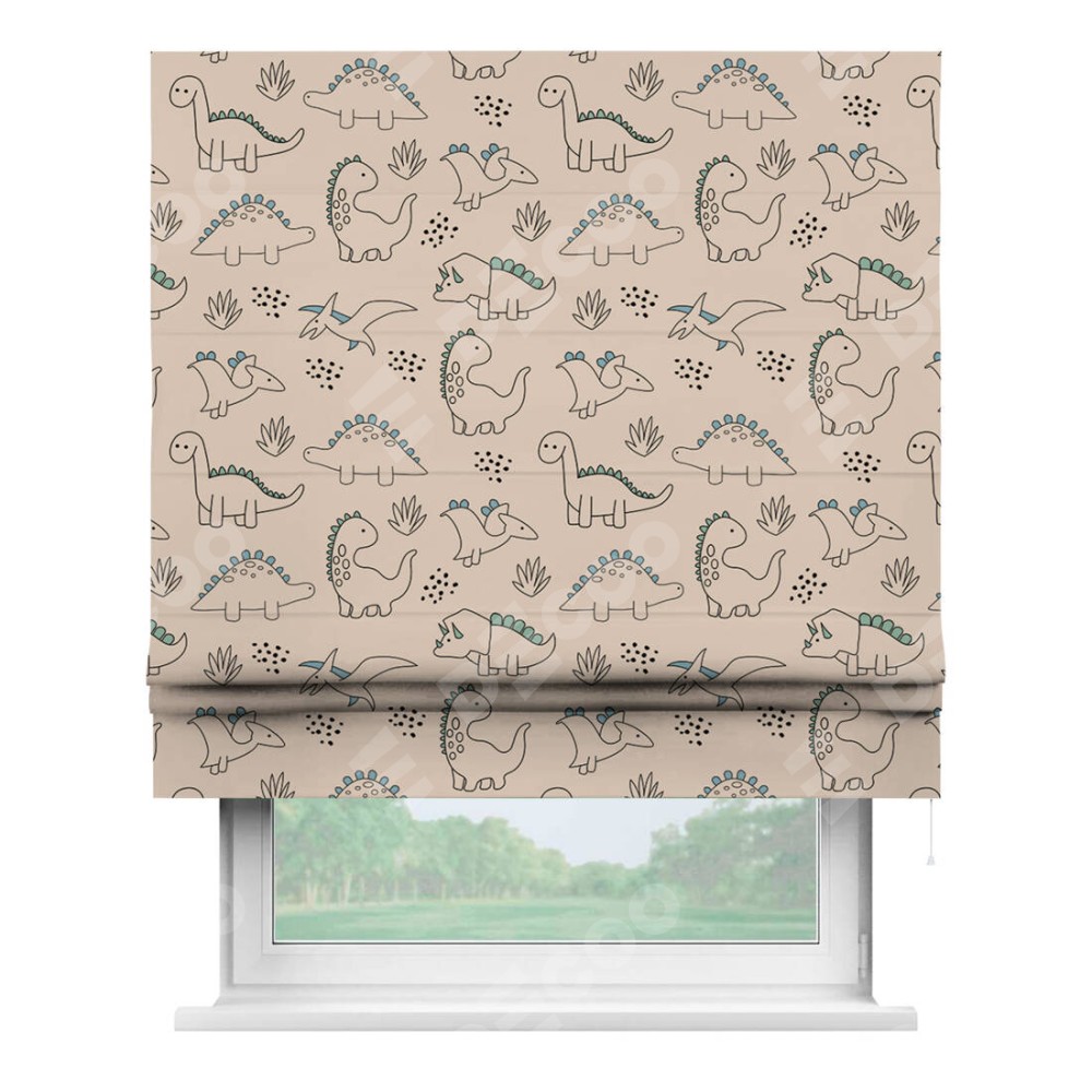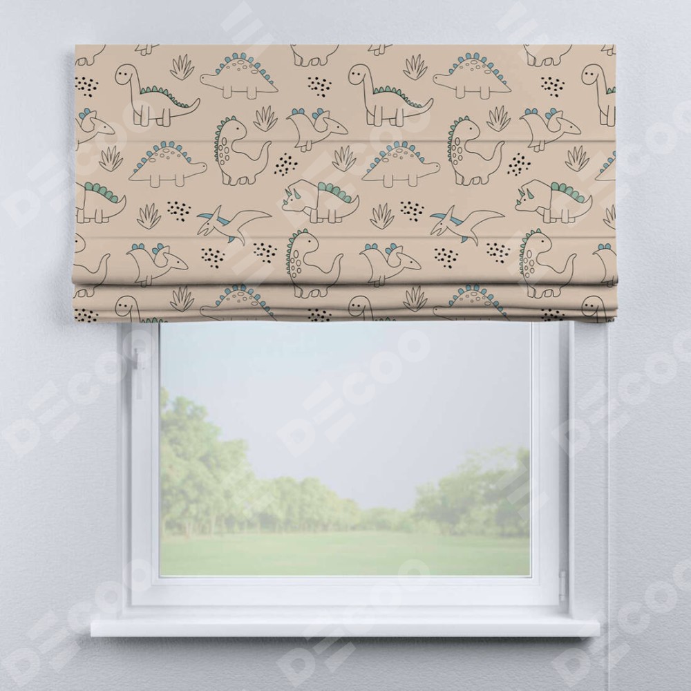 Классическая римская штора производителя «Cortin», пошита из ткани блэкаут с нанесением сублимационной печати «Динозаврики». Имеет универсальный механизм и подходит для монтажа: на потолок, на стену и в нишу.
