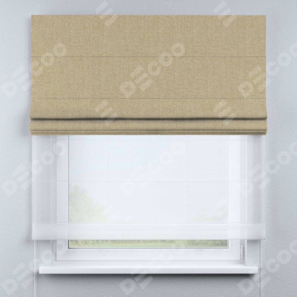 Двойная римская штора «День-ночь» от производителя Cortin предназначена для использования в проёмах. Эта штора уникальна тем, что состоит из двух полотен. На лицевой стороне находится лён димаут песочный (артикул: 16256), обеспечивающий эффективное затемнение. В комплект также входит вторая ткань — легкий белый тюль (артикул: V-01), который добавляет изящества и легкости оформлению окна. Кроме того, доступны и другие разновидности ткани тюль, выбор которых доступен по ссылке .