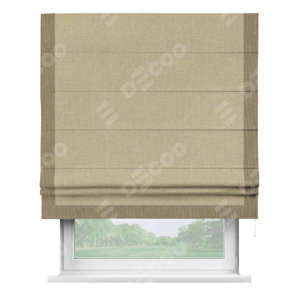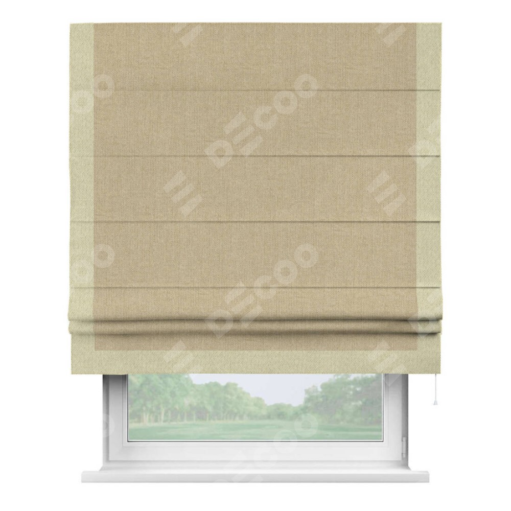 Римская штора с отделкой кантом «Виктория», пошита из ткани лён димаут песочный, артикул: 16256. представляет собой элегантное решение для оконного оформления. Кант по бокам и снизу шторы добавляет изысканности и аккуратности внешнему виду, подчеркивая линии и форму шторы. Этот элемент декора не только украшает, но и выполняет практическую функцию, защищая края ткани от износа. Кант может быть выполнен в контрастном или гармонирующем цвете, что позволяет добиться различных стилевых эффектов и легко вписать штору в интерьер комнаты.