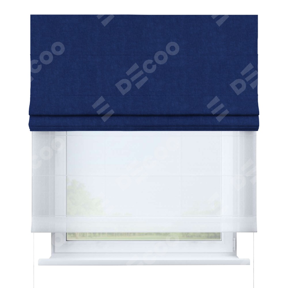 Двойная римская штора «День-ночь» от производителя Cortin предназначена для использования в проёмах. Эта штора уникальна тем, что состоит из двух полотен. На лицевой стороне находится канвас синий электрик (артикул: v-355), обеспечивающий мягкое затемнение. В комплект также входит вторая ткань — легкий белый тюль (артикул: V-01), который добавляет изящества и легкости оформлению окна. Кроме того, доступны и другие разновидности ткани тюль, выбор которых доступен по ссылке .