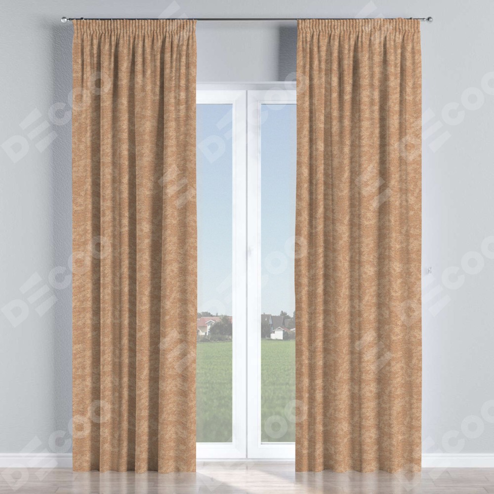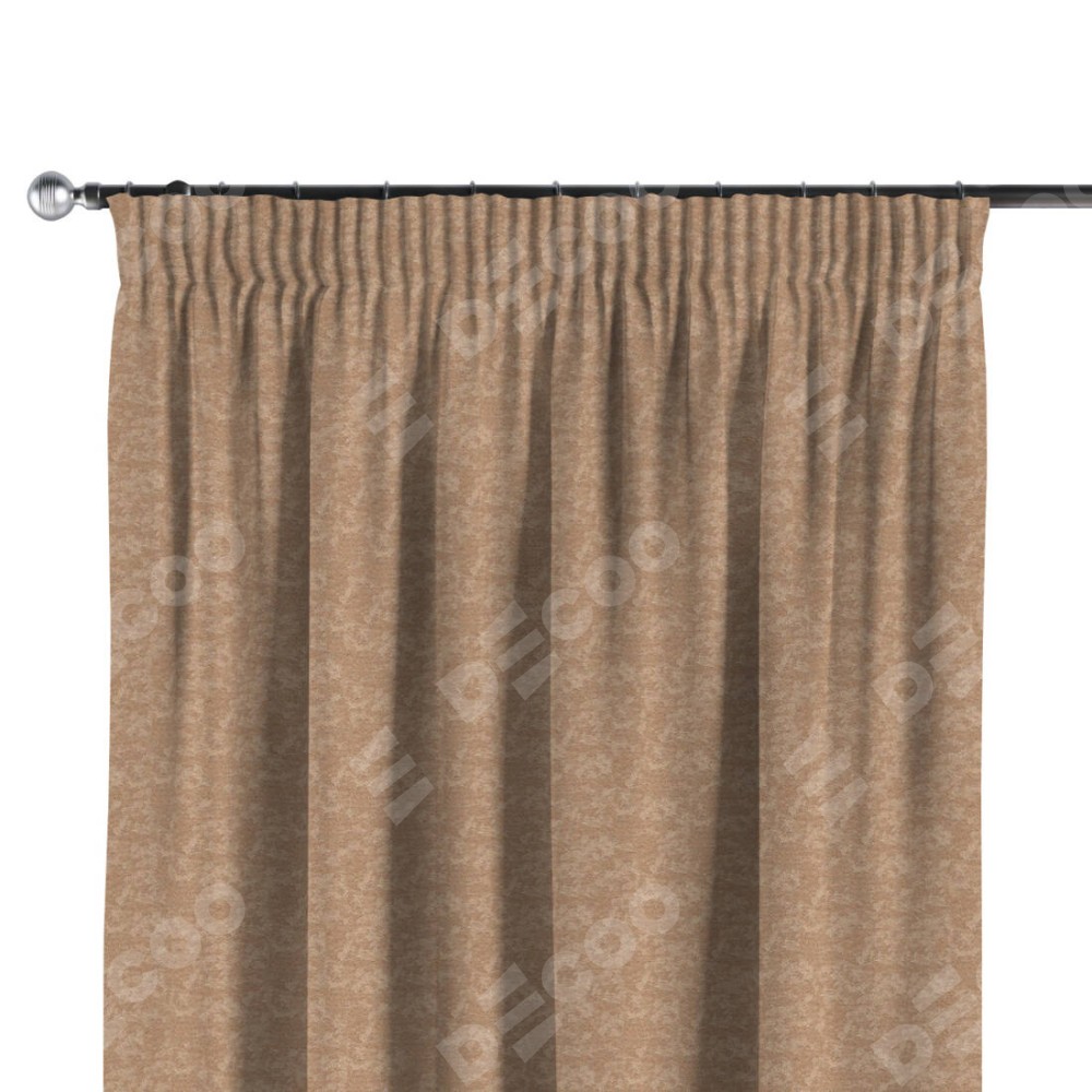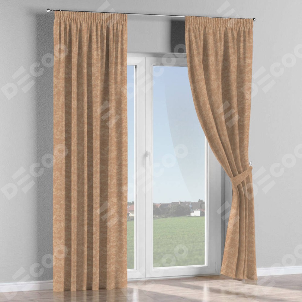 Комплект прямых штор, от производителя «Cortin», пошиты из ткани софт мрамор бронзовый, артикул ткани 93576. С изнаночной стороны в верхней части штор пристрачивается шторная лента с декоративными складками «Карандаш». Для создания элегантных складок прямые шторы шьются по стандарту с коэффициентом 1:2 (на 100 см. ширины проёма 200 см. ширины ткани).