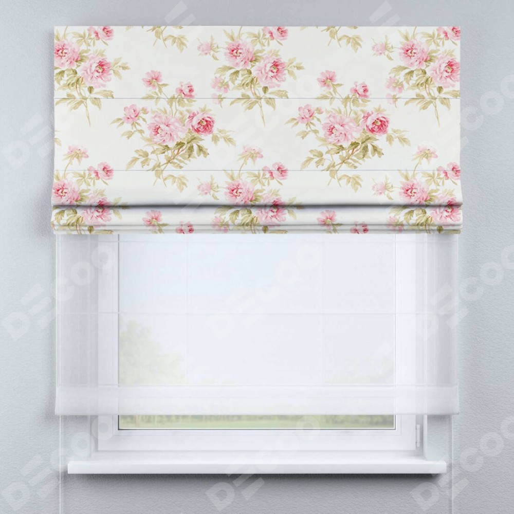 Двойная римская штора «День-ночь» от производителя Cortin предназначена для использования в проёмах. Эта штора уникальна тем, что состоит из двух полотен. На лицевой стороне находится блэкаут с нанесением сублимационной печати «Английский шебби-шик», обеспечивающий эффективное затемнение. В комплект также входит вторая ткань — легкий белый тюль (артикул: V-01), который добавляет изящества и легкости оформлению окна. Кроме того, доступны и другие разновидности ткани тюль, выбор которых доступен по ссылке .