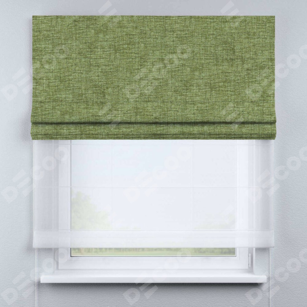 Двойная римская штора «День-ночь» от производителя Cortin предназначена для использования в проёмах. Эта штора уникальна тем, что состоит из двух полотен. На лицевой стороне находится рогожка димаут травяной (артикул: 91021), обеспечивающая комфортное затемнение. В комплект также входит вторая ткань — легкий белый тюль (артикул: V-01), который добавляет изящества и легкости оформлению окна. Кроме того, доступны и другие разновидности ткани тюль, выбор которых доступен по ссылке .