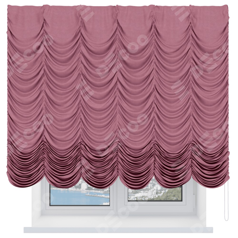 Французская штора производителя «Cortin», используется для проёма, пошита из ткани вельвет брусника, артикул ткани 85550. Имеет универсальный механизм и подходит для монтажа: на потолок и на стену.
