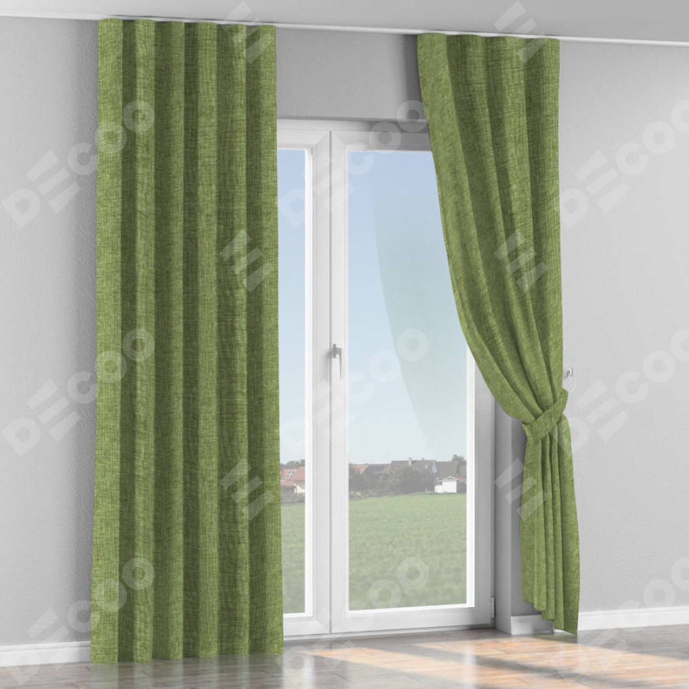 Комплект прямых штор, от производителя «Cortin», пошиты из ткани рогожка димаут травяной, артикул ткани 91021. С изнаночной стороны в верхней части штор пристрачивается шторная лента с декоративными складками «Волна». Для создания элегантных складок прямые шторы шьются по стандарту с коэффициентом 1:2 (на 100 см. ширины проёма 200 см. ширины ткани).
