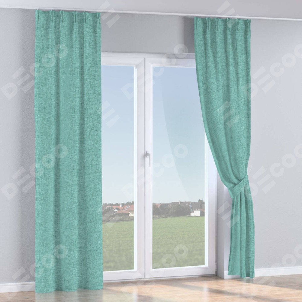 Комплект прямых штор, от производителя «Cortin», пошиты из ткани рогожка димаут аквамариновый крайола, артикул ткани 91023. С изнаночной стороны в верхней части штор пристрачивается шторная лента с декоративными складками «Кустик». Для создания элегантных складок прямые шторы шьются по стандарту с коэффициентом 1:2 (на 100 см. ширины проёма 200 см. ширины ткани).