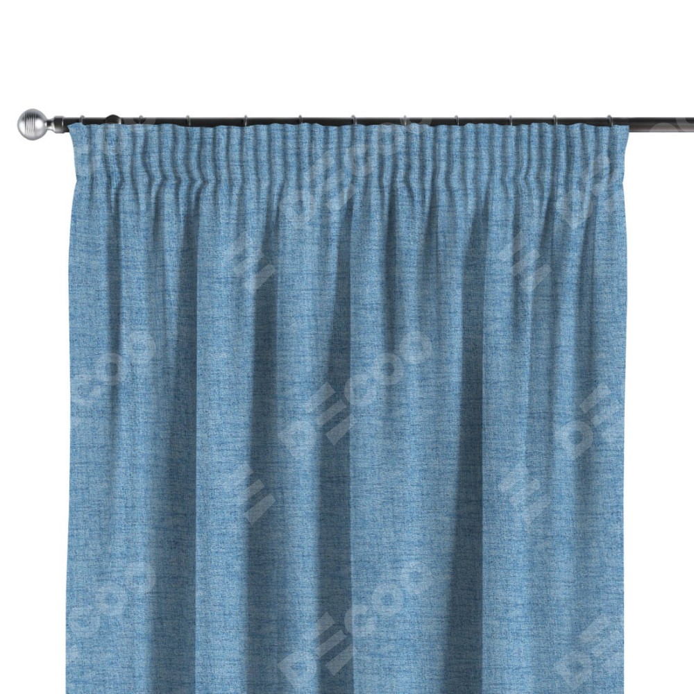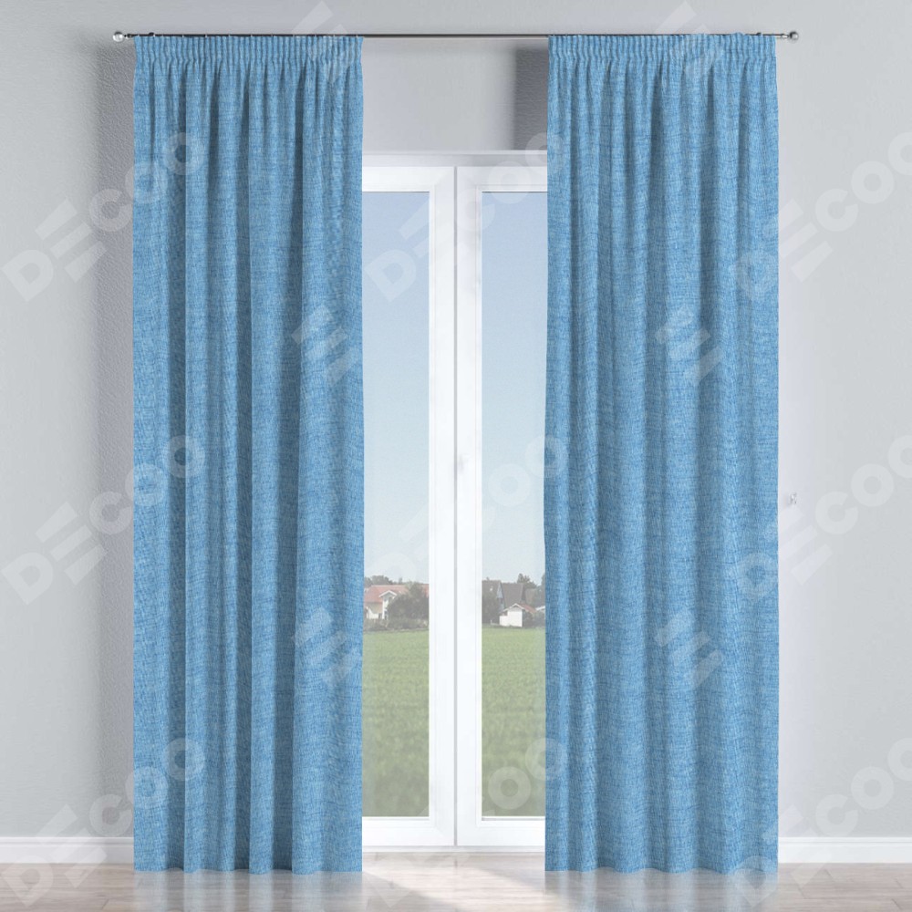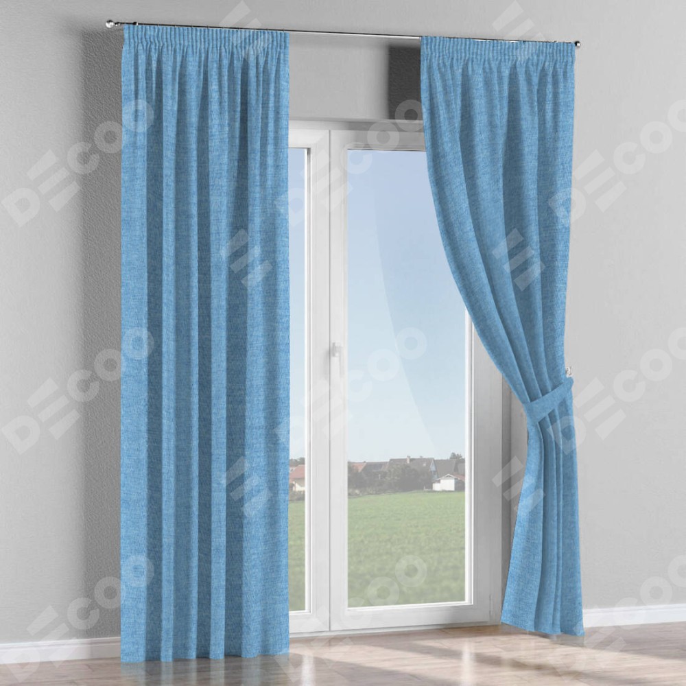 Комплект прямых штор, от производителя «Cortin», пошиты из ткани рогожка димаут голубой, артикул ткани 91025. С изнаночной стороны в верхней части штор пристрачивается шторная лента с декоративными складками «Карандаш». Для создания элегантных складок прямые шторы шьются по стандарту с коэффициентом 1:2 (на 100 см. ширины проёма 200 см. ширины ткани).