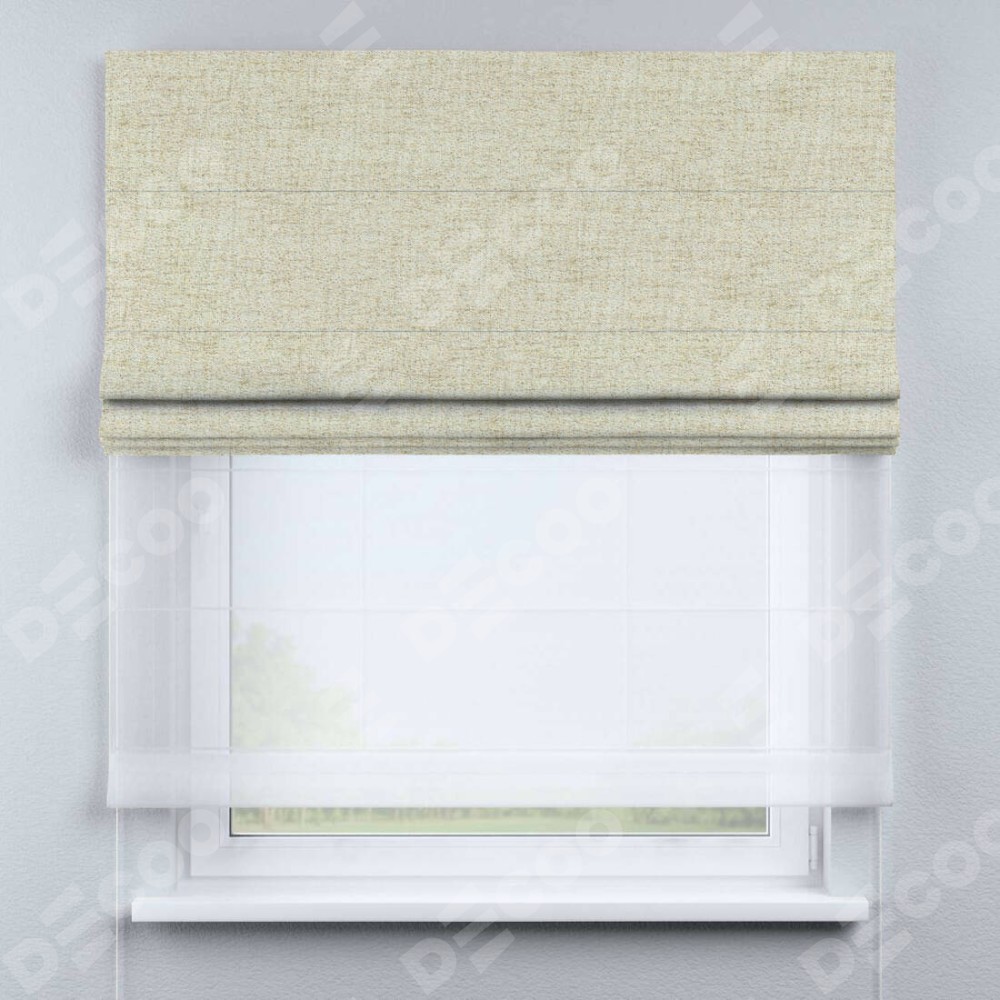 Двойная римская штора «День-ночь» от производителя Cortin предназначена для использования в проёмах. Эта штора уникальна тем, что состоит из двух полотен. На лицевой стороне находится рогожка димаут золотой песок (артикул: 91015), обеспечивающий эффективное затемнение. В комплект также входит вторая ткань — легкий белый тюль (артикул: V-01), который добавляет изящества и легкости оформлению окна. Кроме того, доступны и другие разновидности ткани тюль, выбор которых доступен по ссылке .