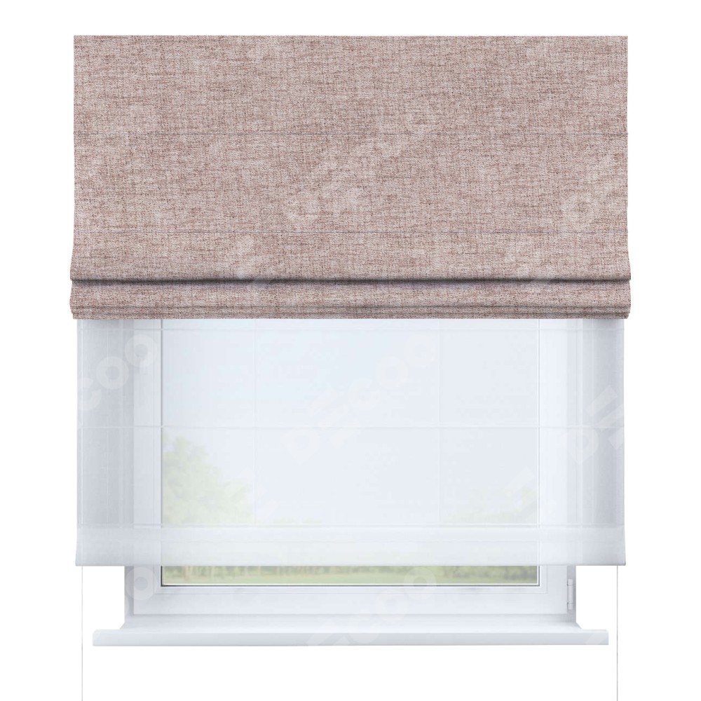Двойная римская штора «День-ночь» от производителя Cortin предназначена для использования в проёмах. Эта штора уникальна тем, что состоит из двух полотен. На лицевой стороне находится рогожка димаут пыльный розовый (артикул: 91019), обеспечивающий эффективное затемнение. В комплект также входит вторая ткань — легкий белый тюль (артикул: V-01), который добавляет изящества и легкости оформлению окна. Кроме того, доступны и другие разновидности ткани тюль, выбор которых доступен по ссылке .