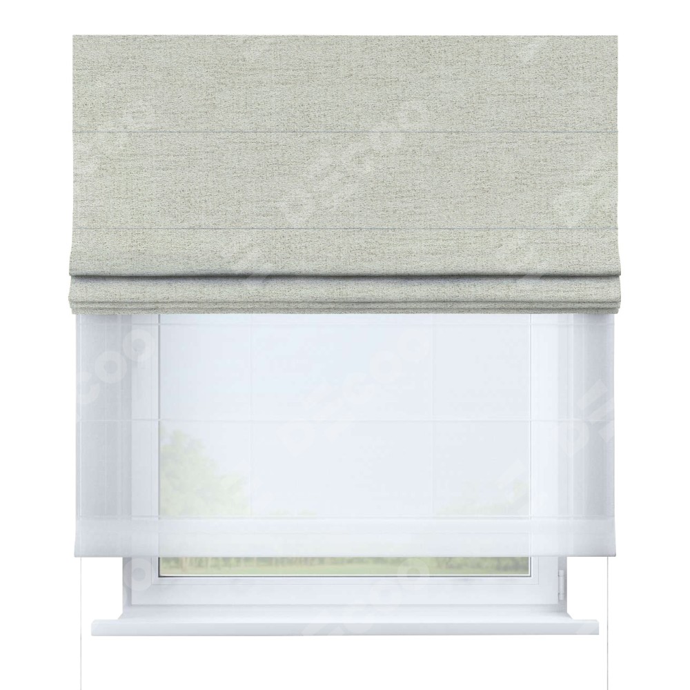 Двойная римская штора «День-ночь» от производителя Cortin предназначена для использования в проёмах. Эта штора уникальна тем, что состоит из двух полотен. На лицевой стороне находится рогожка димаут серо-бежевый (артикул: 91014), обеспечивающий эффективное затемнение. В комплект также входит вторая ткань — легкий белый тюль (артикул: V-01), который добавляет изящества и легкости оформлению окна. Кроме того, доступны и другие разновидности ткани тюль, выбор которых доступен по ссылке .