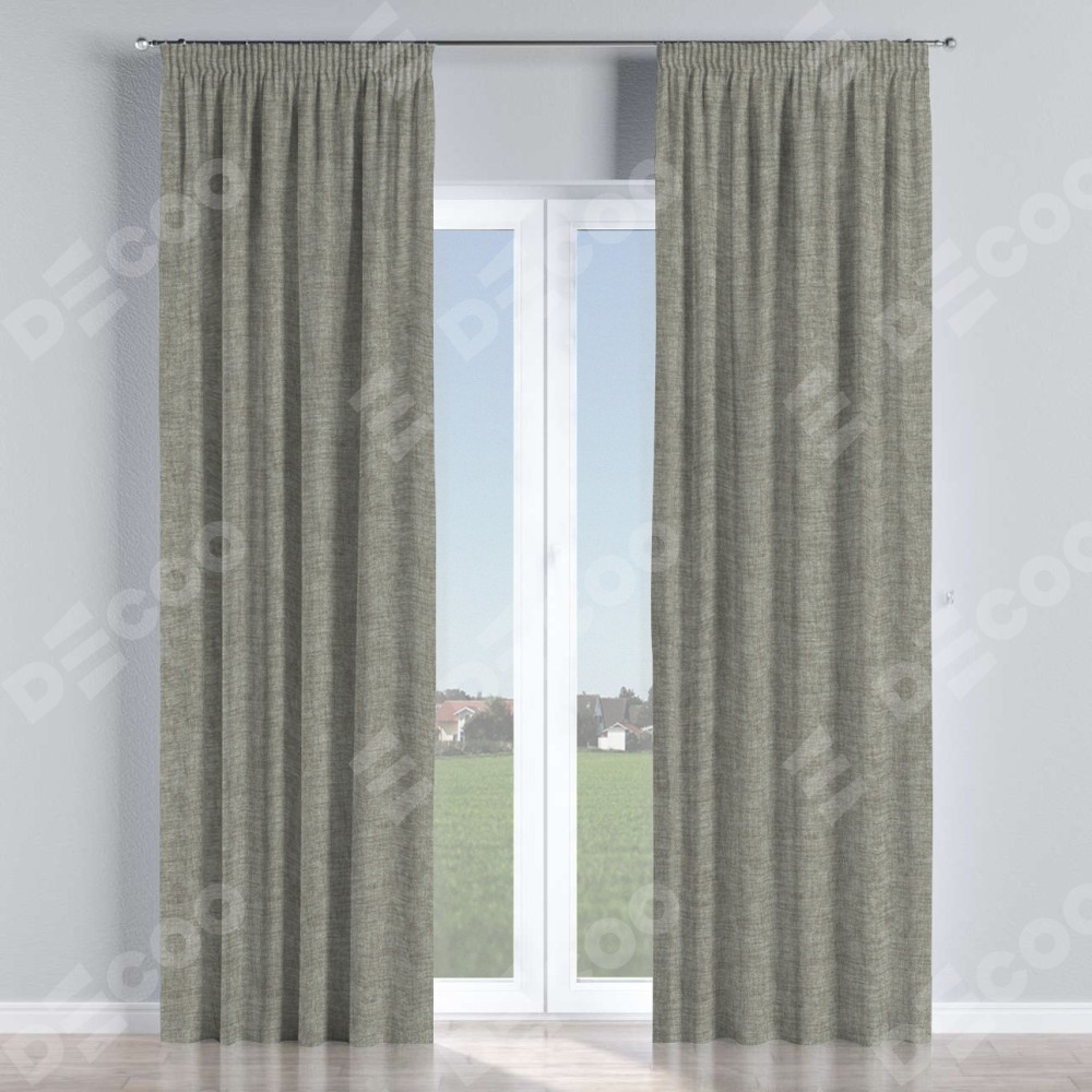 Комплект прямых штор, от производителя «Cortin», пошиты из ткани рогожка димаут серый дуб, артикул ткани 91028. С изнаночной стороны в верхней части штор пристрачивается шторная лента с декоративными складками «Карандаш». Для создания элегантных складок прямые шторы шьются по стандарту с коэффициентом 1:2 (на 100 см. ширины проёма 200 см. ширины ткани).