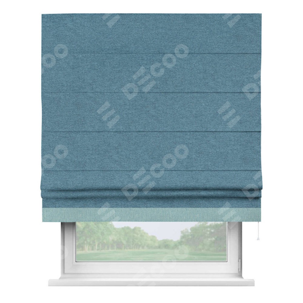 Римская штора пошита из ткани твид блэкаут светло-синий, артикул: 90935, с отделкой кантом «Джестер» выделяется своей уникальной особенностью — кантом, расположенным только снизу шторы. Этот дизайн добавляет оригинальности и игривости оконному оформлению, делая акцент на нижней части шторы и создавая интересный визуальный эффект. Отделка кантом на нижнем крае не только служит эстетической функции, но и способствует увеличению прочности и износостойкости ткани в этом месте.