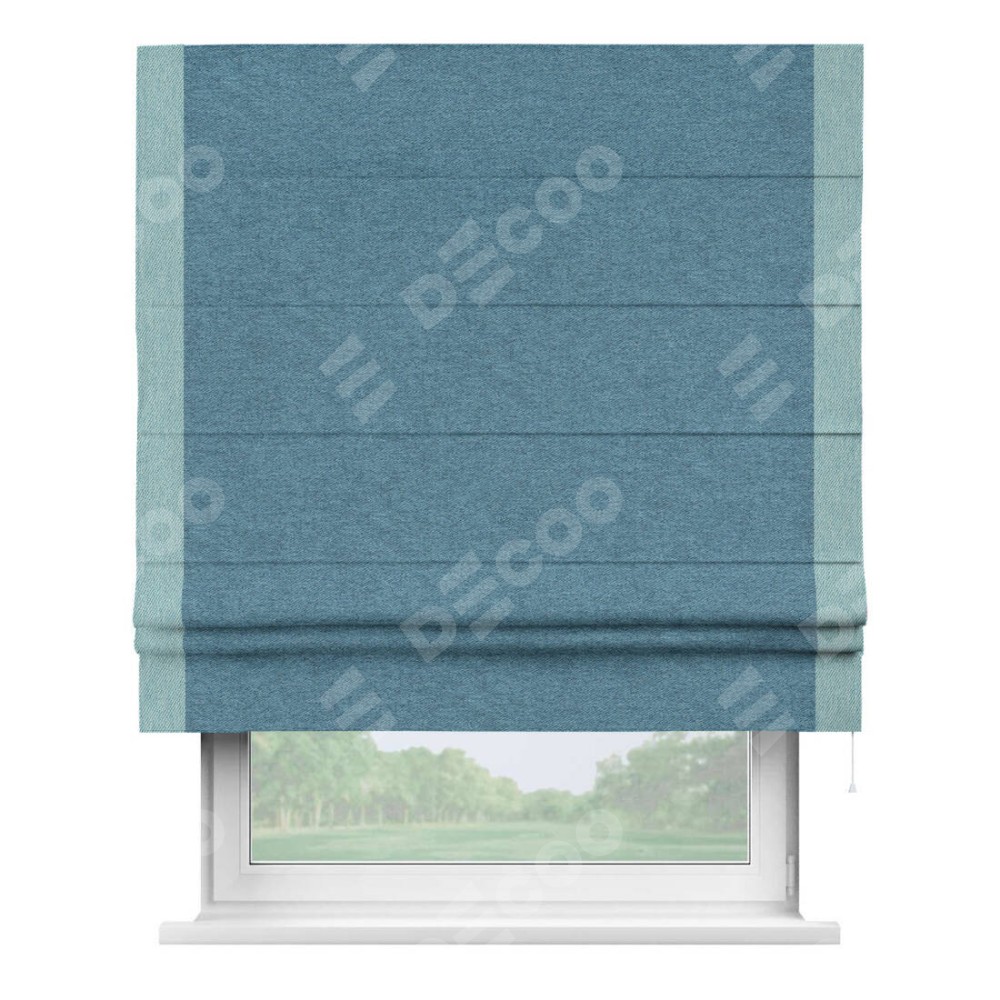 Римская штора пошита из ткани твид блэкаут светло-синий, артикул: 90935, с отделкой кантом «Стрим Дуо» выделяется наличием кантов по обоим бокам шторы, слева и справа. Этот дизайн придает шторе аккуратный и завершенный вид, акцентируя вертикальные линии и визуально вытягивая окно в высоту. Отделка кантом по бокам не только украшает штору, но и служит практической функцией, укрепляя края и продлевая срок службы изделия.