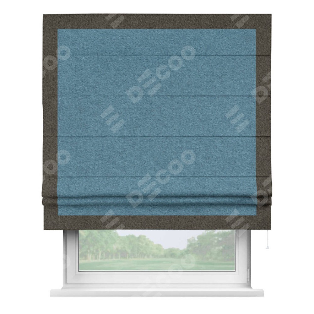 Римская штора пошита из ткани твид блэкаут светло-синий, артикул: 90935, с отделкой кантом «Чесс» отличается своей уникальной деталью — наличием канта не только по бокам и снизу, но и сверху по всем краям шторы. Это придает шторе особенно аккуратный и завершенный вид, делая акцент на границах и форме шторы. Отделка кантом по всему периметру шторы усиливает её декоративные качества и подчеркивает строгую геометрию, что может быть особенно актуально для современных и минималистичных интерьеров.