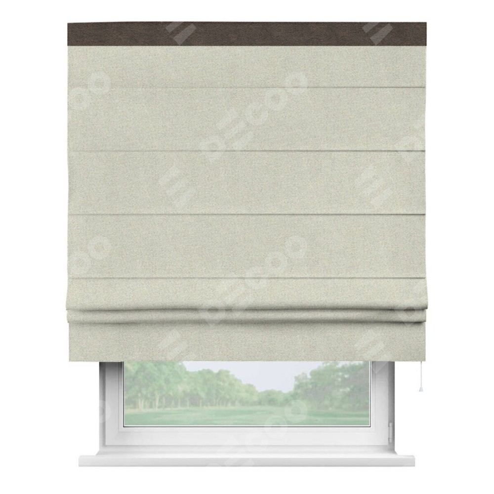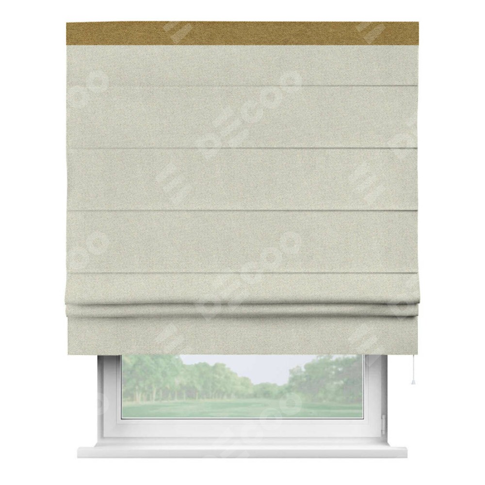 Римская штора пошита из ткани твид блэкаут шампань, артикул: 90929, с отделкой кантом «Кинг» отличается своей необычной особенностью: кант располагается исключительно сверху шторы. Такой дизайн делает акцент на верхней части окна, визуально поднимая потолок и придавая интерьеру более возвышенный и изысканный вид. Отделка кантом на верхней кромке не только украшает штору, но и может служить дополнительной защитой от износа в месте наибольшего контакта с механизмом управления шторой.