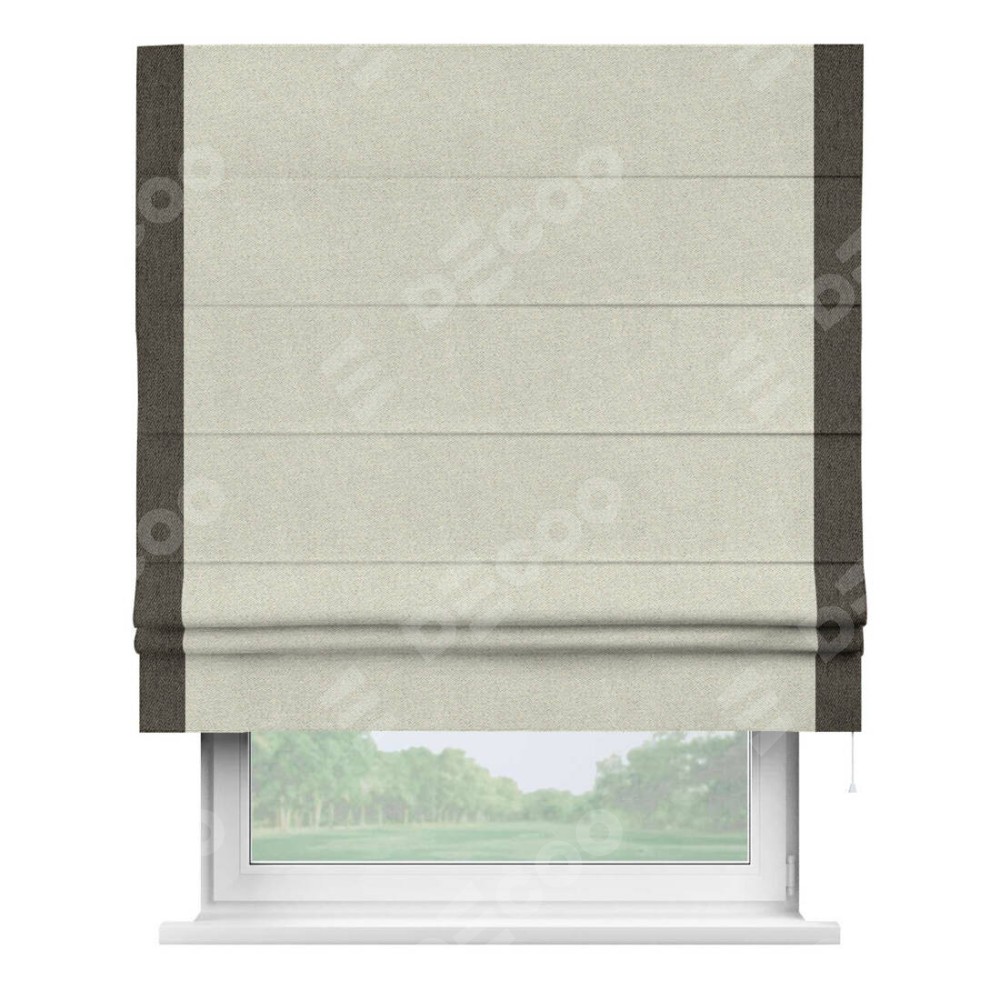 Римская штора пошита из ткани твид блэкаут шампань, артикул: 90929, с отделкой кантом «Стрим Дуо» выделяется наличием кантов по обоим бокам шторы, слева и справа. Этот дизайн придает шторе аккуратный и завершенный вид, акцентируя вертикальные линии и визуально вытягивая окно в высоту. Отделка кантом по бокам не только украшает штору, но и служит практической функцией, укрепляя края и продлевая срок службы изделия.