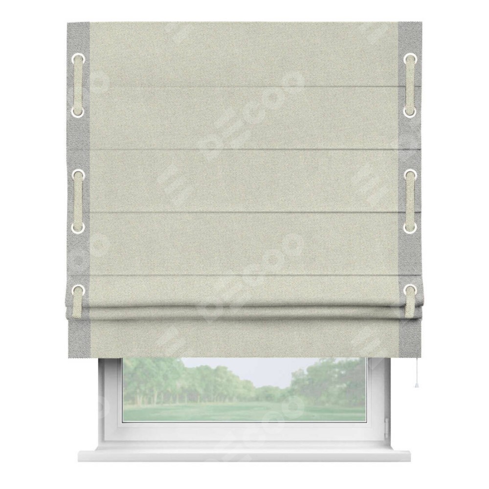 Декоративные люверсы на кантах могут выполнять как чисто украшательную функцию, так и быть частью механизма для протягивания декоративного пояска, что добавляет изделию уникальности и игривости. Поясок из основного цвета римской шторы, протянутый через люверсы, не только укрепляет вертикальную композицию, но и позволяет создавать различные драпировки, регулируя внешний вид шторы по желанию.
