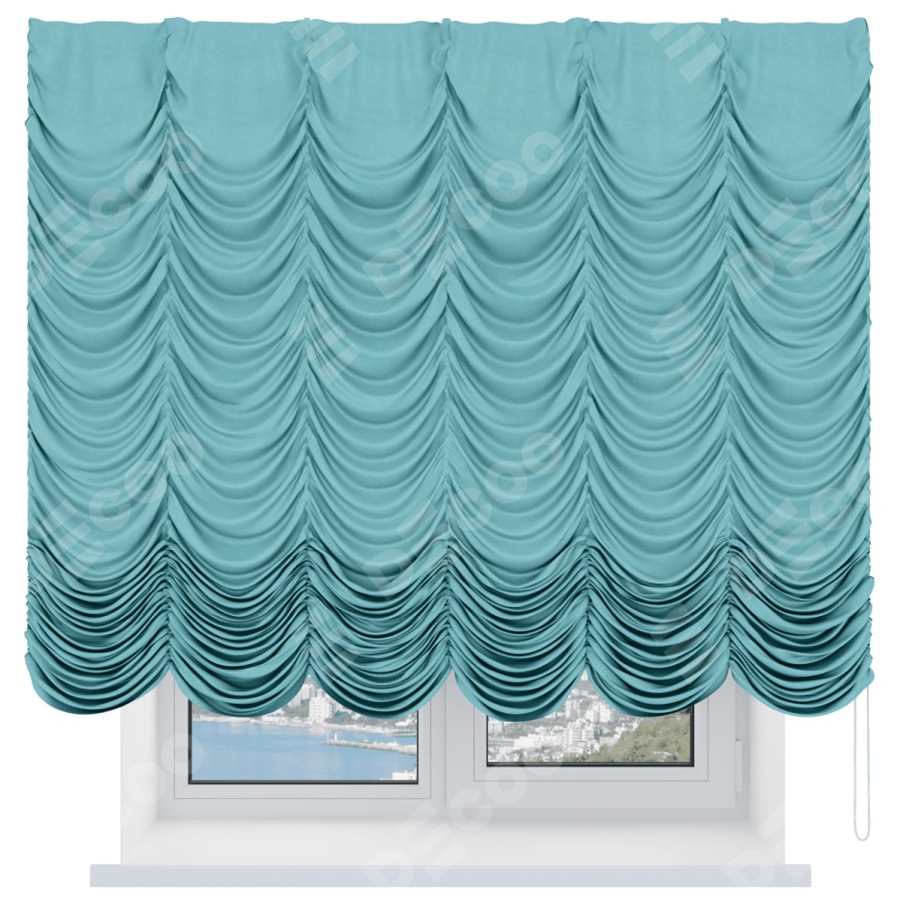 Французская штора производителя «Cortin», используется для проёма, пошита из ткани вельвет тиффани, артикул ткани 17765. Имеет универсальный механизм и подходит для монтажа: на потолок и на стену.