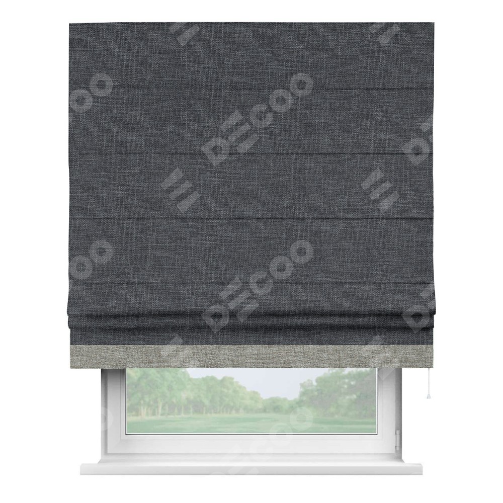 Римская штора пошита из ткани рогожка димаут графит, артикул: 90950, с отделкой кантом «Джестер» выделяется своей уникальной особенностью — кантом, расположенным только снизу шторы. Этот дизайн добавляет оригинальности и игривости оконному оформлению, делая акцент на нижней части шторы и создавая интересный визуальный эффект. Отделка кантом на нижнем крае не только служит эстетической функции, но и способствует увеличению прочности и износостойкости ткани в этом месте.