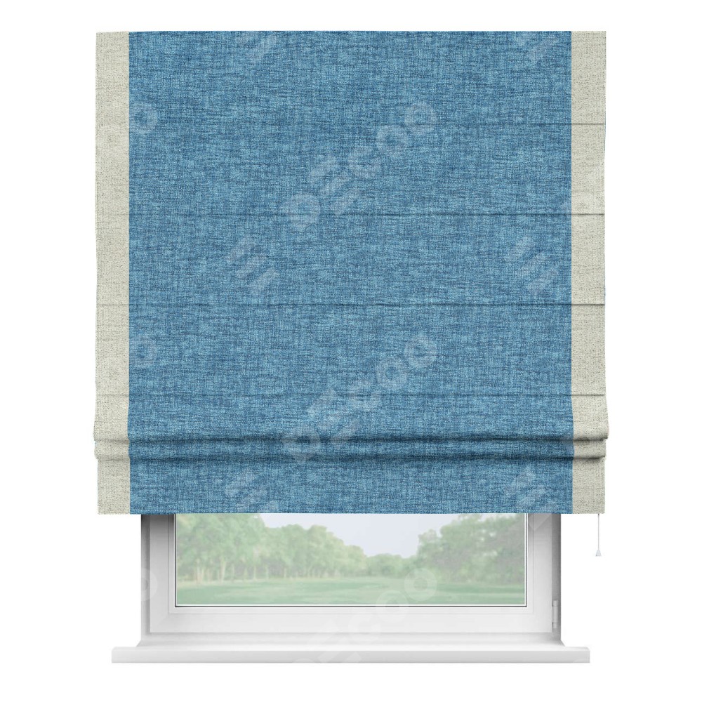 Римская штора пошита из ткани рогожка димаут джинс, артикул: 91026, с отделкой кантом «Стрим Дуо» выделяется наличием кантов по обоим бокам шторы, слева и справа. Этот дизайн придает шторе аккуратный и завершенный вид, акцентируя вертикальные линии и визуально вытягивая окно в высоту. Отделка кантом по бокам не только украшает штору, но и служит практической функцией, укрепляя края и продлевая срок службы изделия.