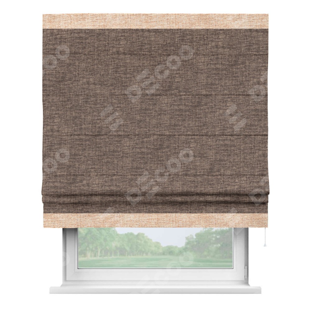 Римская штора пошита из ткани рогожка димаут коричневый, артикул: 91018, с отделкой кантом «Горизонт» предлагает уникальное дизайнерское решение, при котором кант располагается только вверху и снизу шторы. Такое решение делает акцент на горизонтальных линиях, визуально расширяя пространство и придавая окну более строгий и организованный вид. Отделка кантом в этих ключевых местах не только украшает штору, но и способствует её долговечности, защищая наиболее уязвимые к износу края.