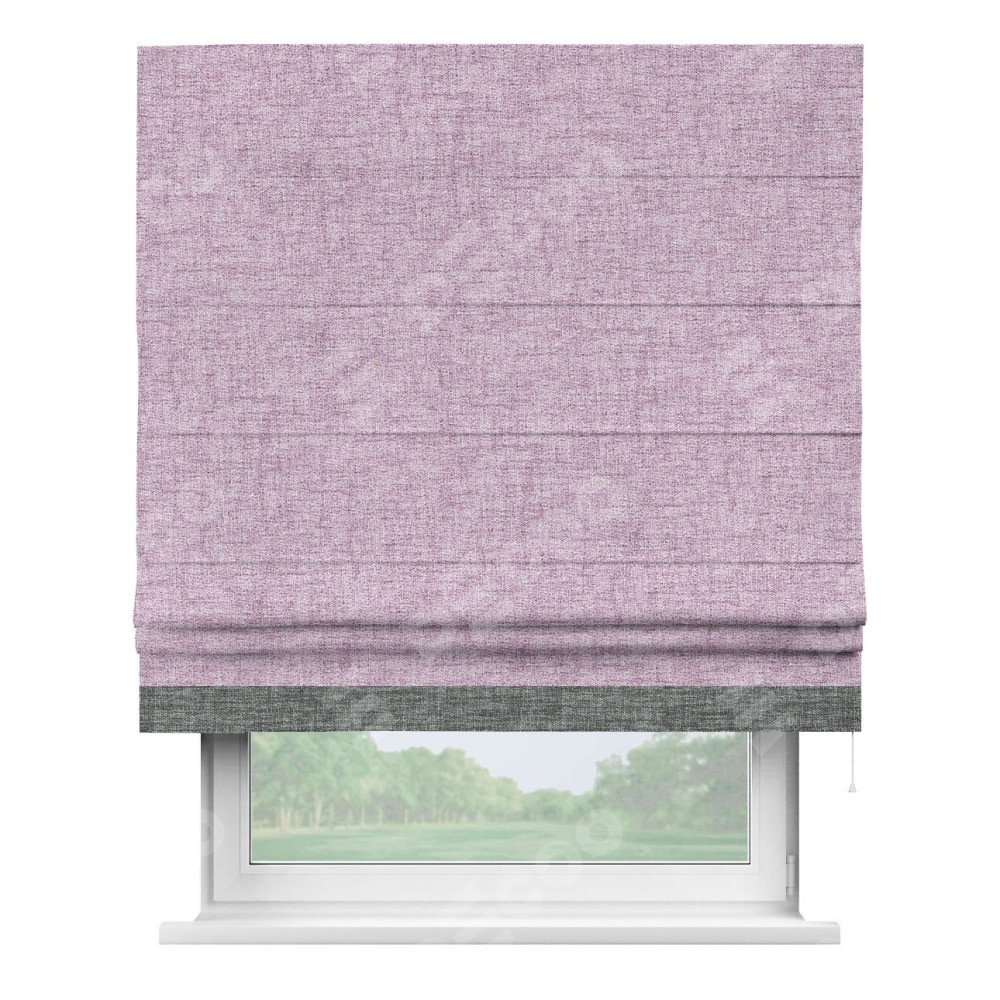 Римская штора пошита из ткани рогожка димаут розовый, артикул: 91031, с отделкой кантом «Джестер» выделяется своей уникальной особенностью — кантом, расположенным только снизу шторы. Этот дизайн добавляет оригинальности и игривости оконному оформлению, делая акцент на нижней части шторы и создавая интересный визуальный эффект. Отделка кантом на нижнем крае не только служит эстетической функции, но и способствует увеличению прочности и износостойкости ткани в этом месте.
