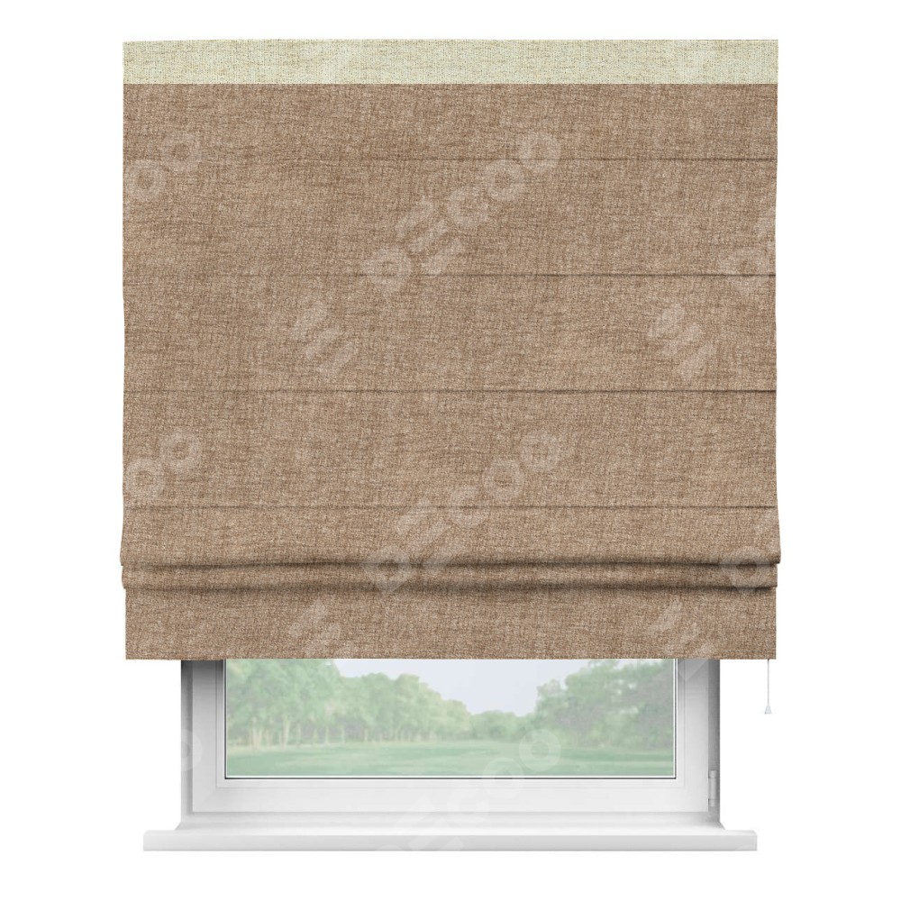 Римская штора пошита из ткани рогожка димаут светло-коричневый, артикул: 91017, с отделкой кантом «Кинг» отличается своей необычной особенностью: кант располагается исключительно сверху шторы. Такой дизайн делает акцент на верхней части окна, визуально поднимая потолок и придавая интерьеру более возвышенный и изысканный вид. Отделка кантом на верхней кромке не только украшает штору, но и может служить дополнительной защитой от износа в месте наибольшего контакта с механизмом управления шторой.