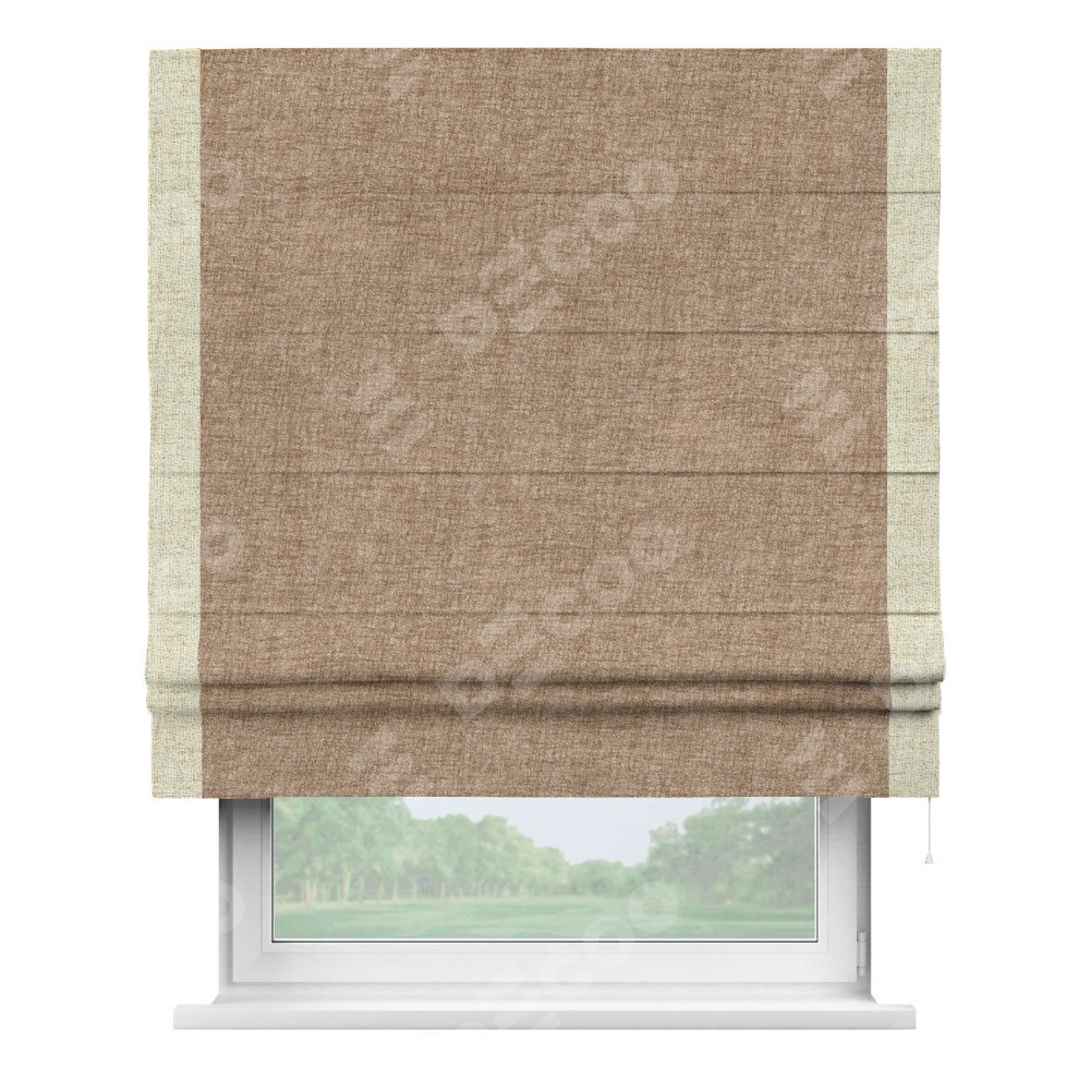 Римская штора пошита из ткани рогожка димаут светло-коричневый, артикул: 91017, с отделкой кантом «Стрим Дуо» выделяется наличием кантов по обоим бокам шторы, слева и справа. Этот дизайн придает шторе аккуратный и завершенный вид, акцентируя вертикальные линии и визуально вытягивая окно в высоту. Отделка кантом по бокам не только украшает штору, но и служит практической функцией, укрепляя края и продлевая срок службы изделия.