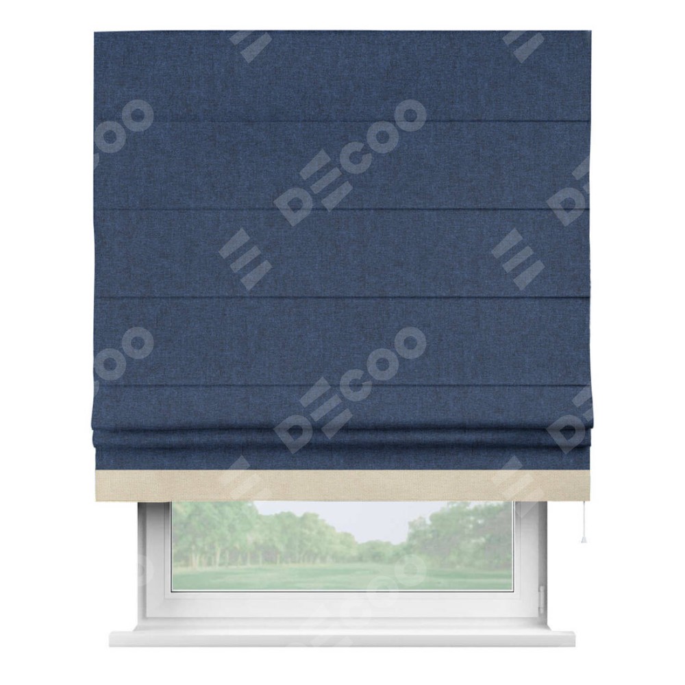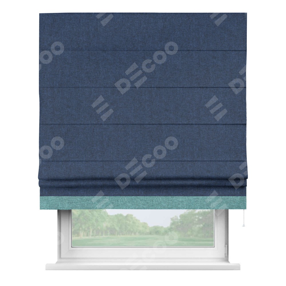 Римская штора пошита из ткани лён кашемир тёмно-синий, артикул: 17215, с отделкой кантом «Джестер» выделяется своей уникальной особенностью — кантом, расположенным только снизу шторы. Этот дизайн добавляет оригинальности и игривости оконному оформлению, делая акцент на нижней части шторы и создавая интересный визуальный эффект. Отделка кантом на нижнем крае не только служит эстетической функции, но и способствует увеличению прочности и износостойкости ткани в этом месте.
