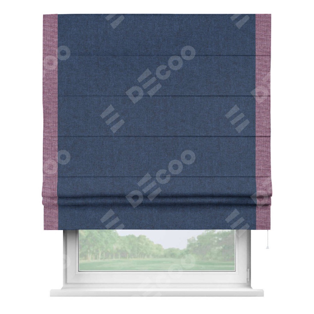 Римская штора пошита из ткани лён кашемир тёмно-синий, артикул: 17215, с отделкой кантом «Стрим Дуо» выделяется наличием кантов по обоим бокам шторы, слева и справа. Этот дизайн придает шторе аккуратный и завершенный вид, акцентируя вертикальные линии и визуально вытягивая окно в высоту. Отделка кантом по бокам не только украшает штору, но и служит практической функцией, укрепляя края и продлевая срок службы изделия.