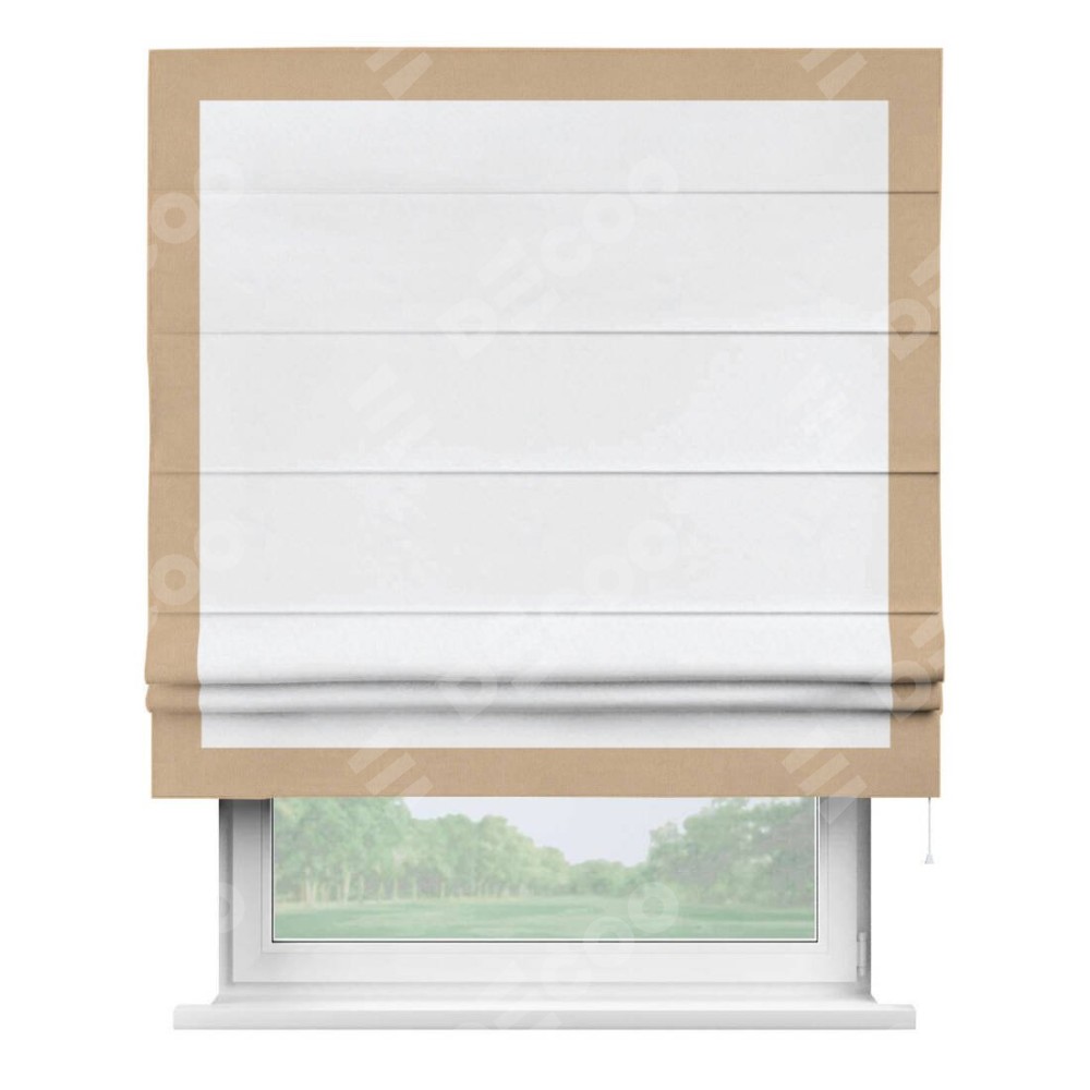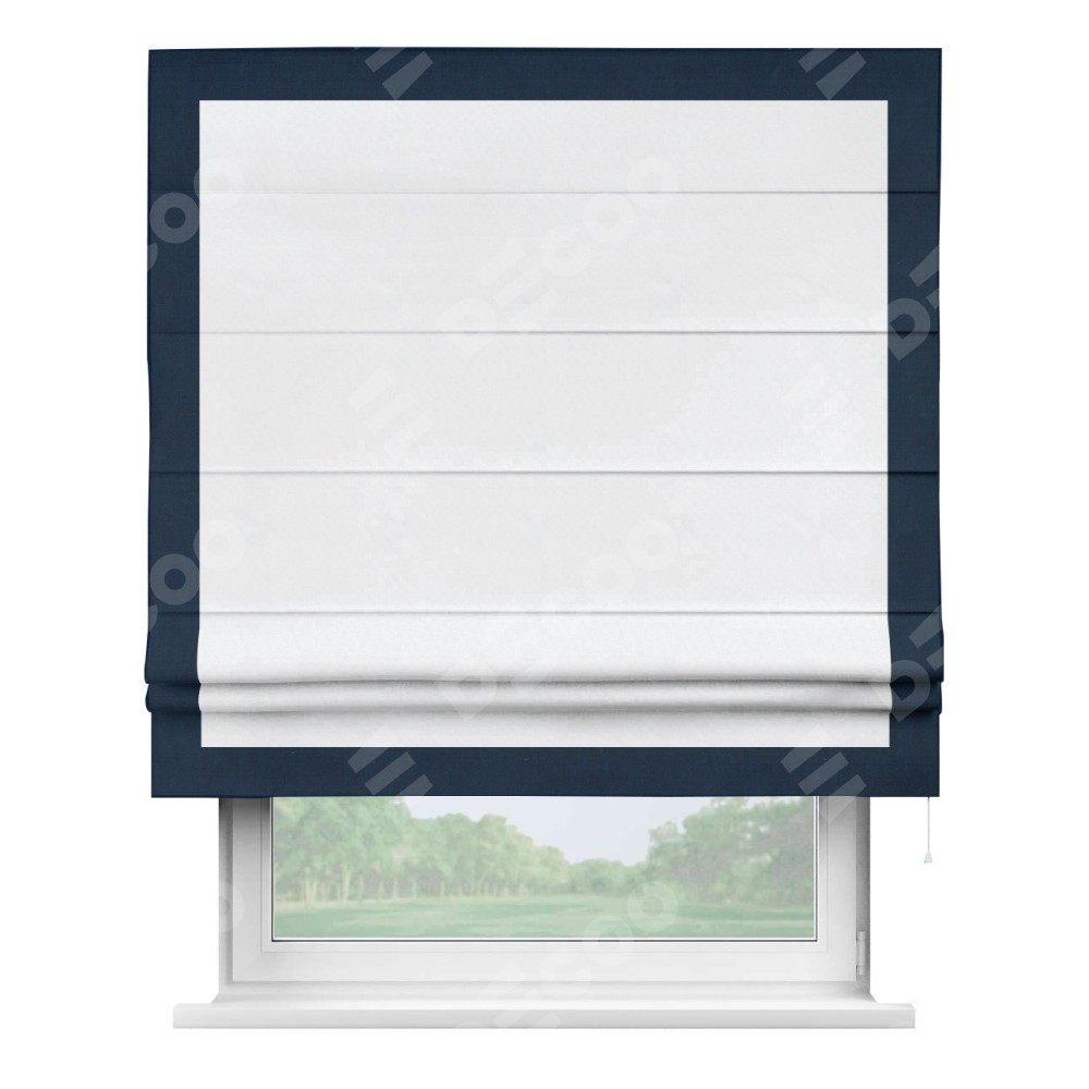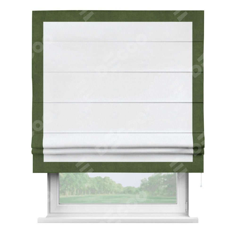Римская штора пошита из ткани вельвет белоснежный, артикул: 92698, с отделкой кантом «Чесс» отличается своей уникальной деталью — наличием канта не только по бокам и снизу, но и сверху по всем краям шторы. Это придает шторе особенно аккуратный и завершенный вид, делая акцент на границах и форме шторы. Отделка кантом по всему периметру шторы усиливает её декоративные качества и подчеркивает строгую геометрию, что может быть особенно актуально для современных и минималистичных интерьеров.