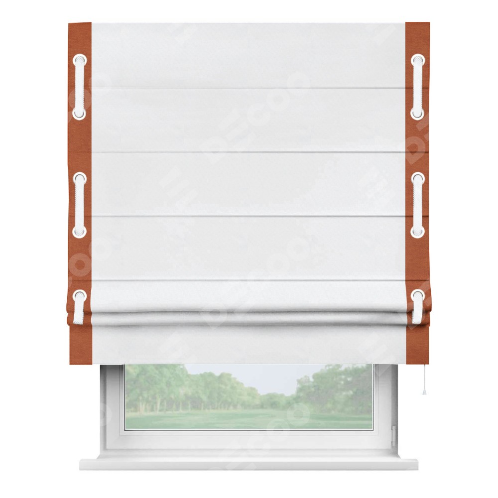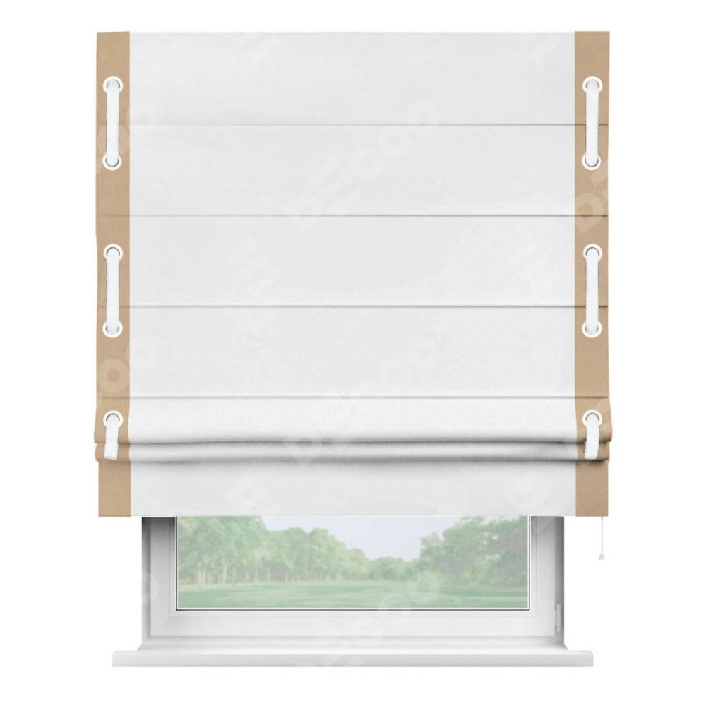 Римская штора пошита из ткани вельвет белоснежный, артикул: 92698, с отделкой кантом «Стрим Дуо», дополненная декоративными люверсами на этих кантах и протянутым пояском из основного цвета римской шторы, представляет собой высоко декоративное и функциональное решение для оконного оформления. Канты, расположенные по обеим боковым сторонам шторы, уже добавляют изысканности и завершенности внешнему виду. Добавление люверсов и пояска не только усиливает декоративный эффект, но и придает шторе дополнительную текстурность и глубину.