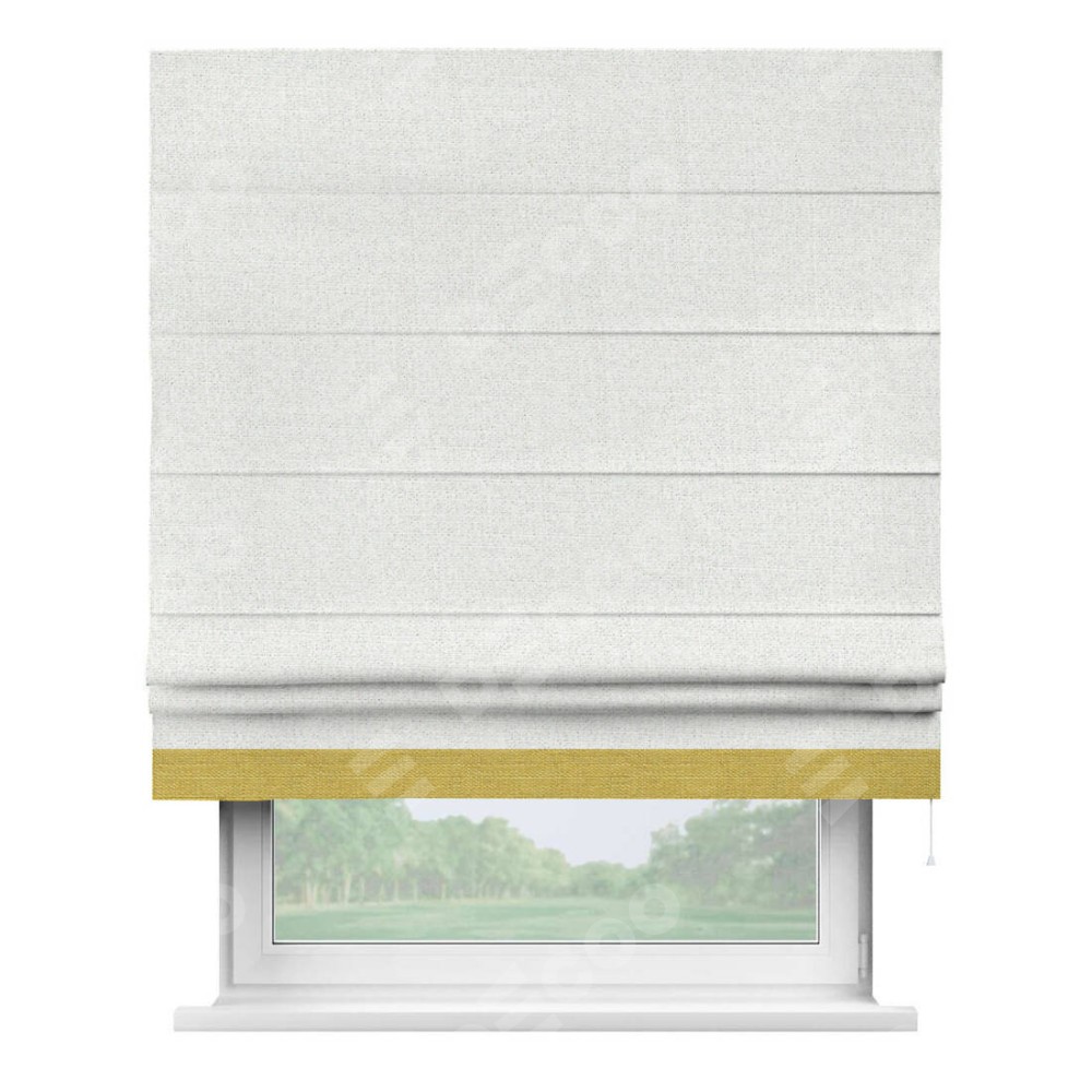 Римская штора пошита из ткани лён шампань, артикул: 91399, с отделкой кантом «Джестер» выделяется своей уникальной особенностью — кантом, расположенным только снизу шторы. Этот дизайн добавляет оригинальности и игривости оконному оформлению, делая акцент на нижней части шторы и создавая интересный визуальный эффект. Отделка кантом на нижнем крае не только служит эстетической функции, но и способствует увеличению прочности и износостойкости ткани в этом месте.