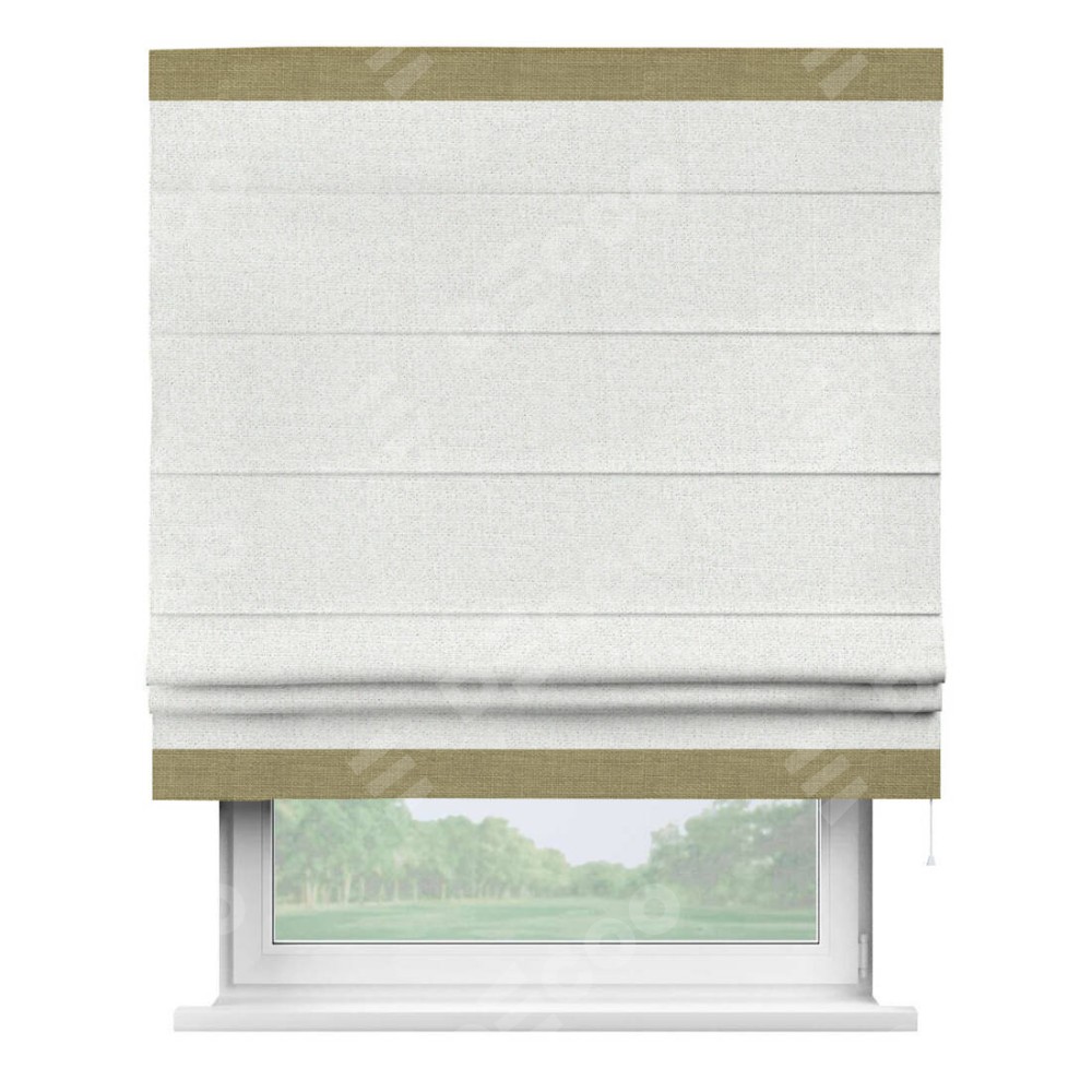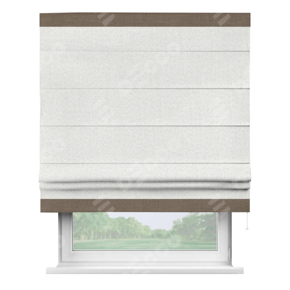 Римская штора пошита из ткани лён шампань, артикул: 91399, с отделкой кантом «Горизонт» предлагает уникальное дизайнерское решение, при котором кант располагается только вверху и снизу шторы. Такое решение делает акцент на горизонтальных линиях, визуально расширяя пространство и придавая окну более строгий и организованный вид. Отделка кантом в этих ключевых местах не только украшает штору, но и способствует её долговечности, защищая наиболее уязвимые к износу края.