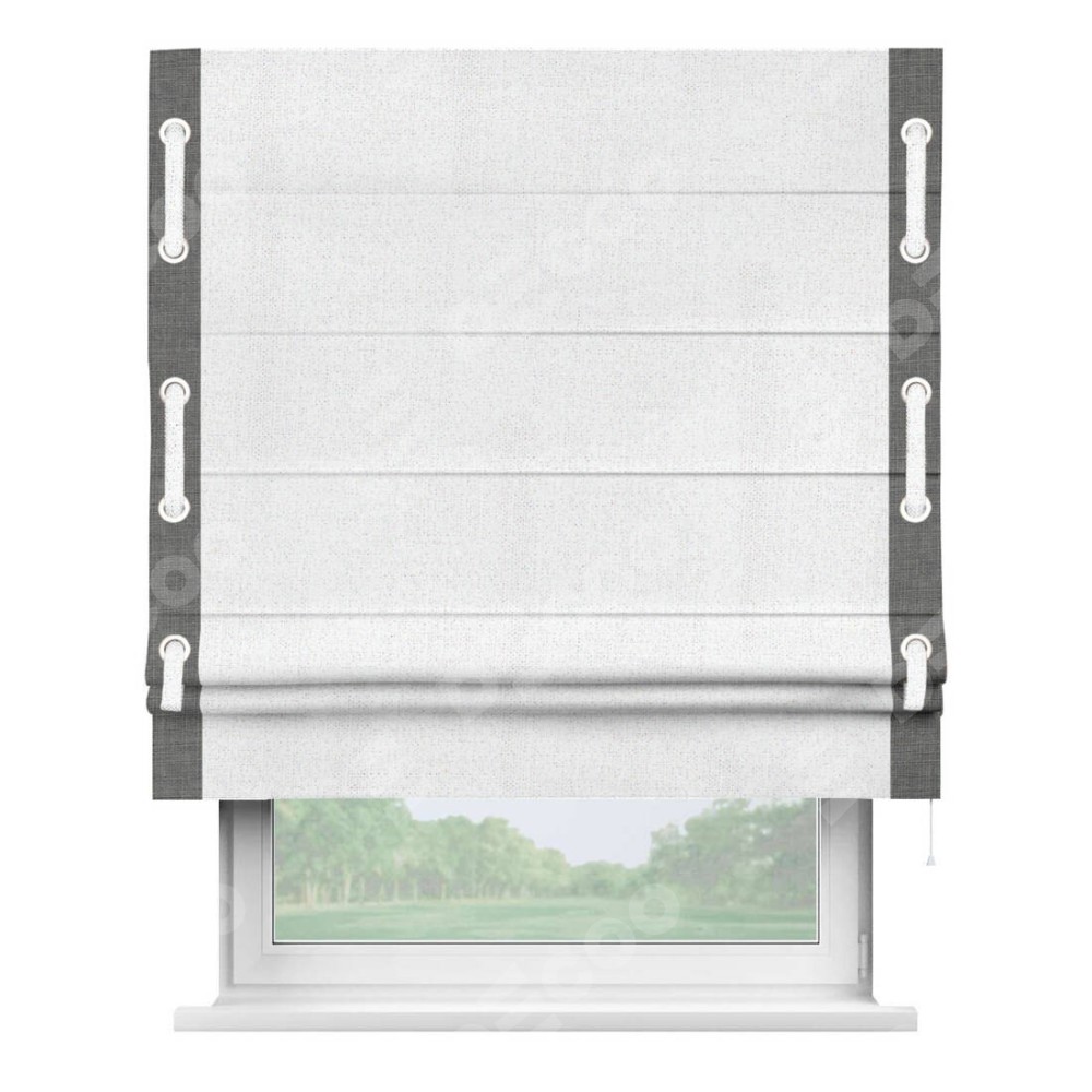 Римская штора пошита из ткани лён белоснежный, артикул: 95632, с отделкой кантом «Стрим Дуо», дополненная декоративными люверсами на этих кантах и протянутым пояском из основного цвета римской шторы, представляет собой высоко декоративное и функциональное решение для оконного оформления. Канты, расположенные по обеим боковым сторонам шторы, уже добавляют изысканности и завершенности внешнему виду. Добавление люверсов и пояска не только усиливает декоративный эффект, но и придает шторе дополнительную текстурность и глубину.