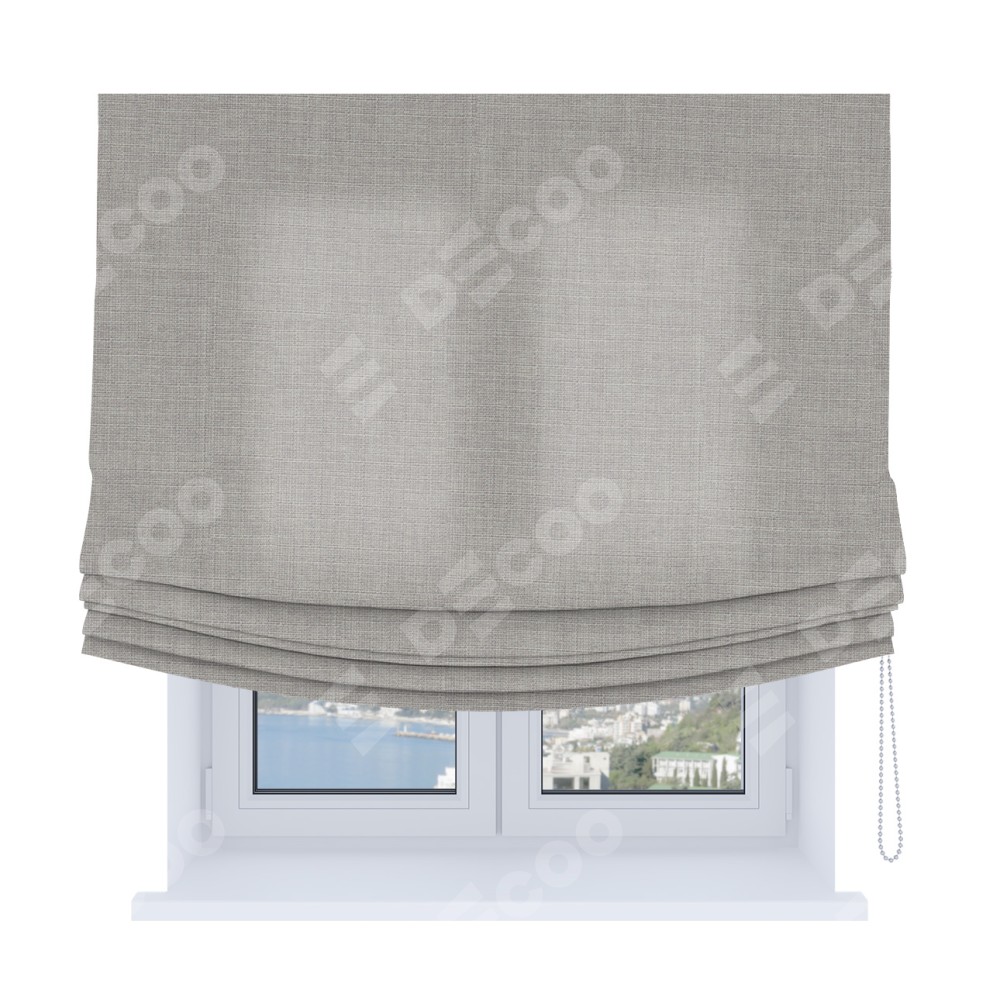Римская штора Soft производителя «Cortin», используется для проёма, пошита из ткани лён серый, артикул ткани 91410. Имеет универсальный механизм и подходит для монтажа: на потолок, на стену и в нишу. В отличие от стандартных римских штор, римская штора Soft не имеет горизонтальных вставок и нижнего отвеса. Это позволяет ткани произвольно драпироваться в свободные мягкие складки.