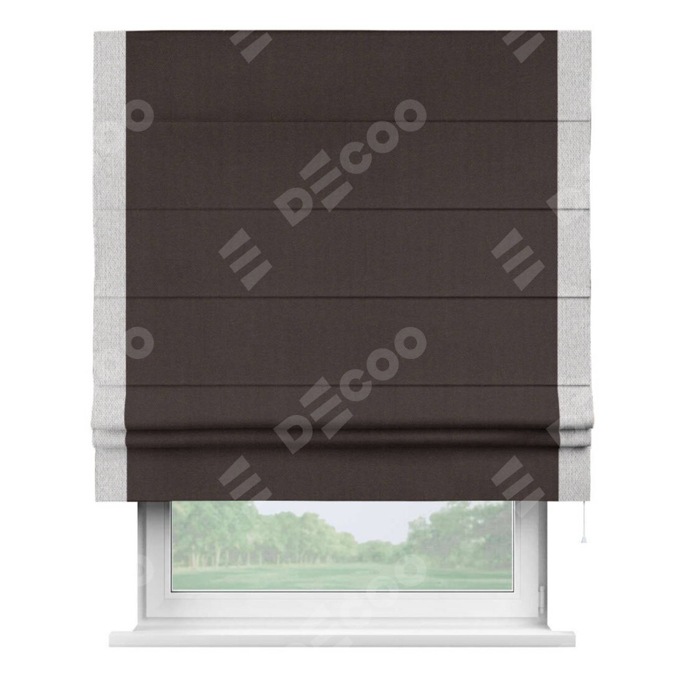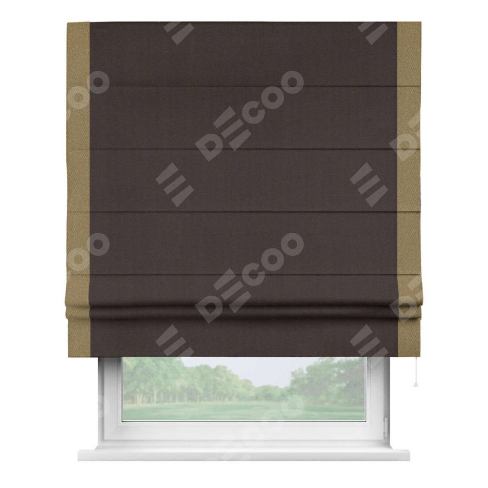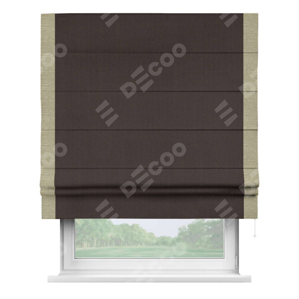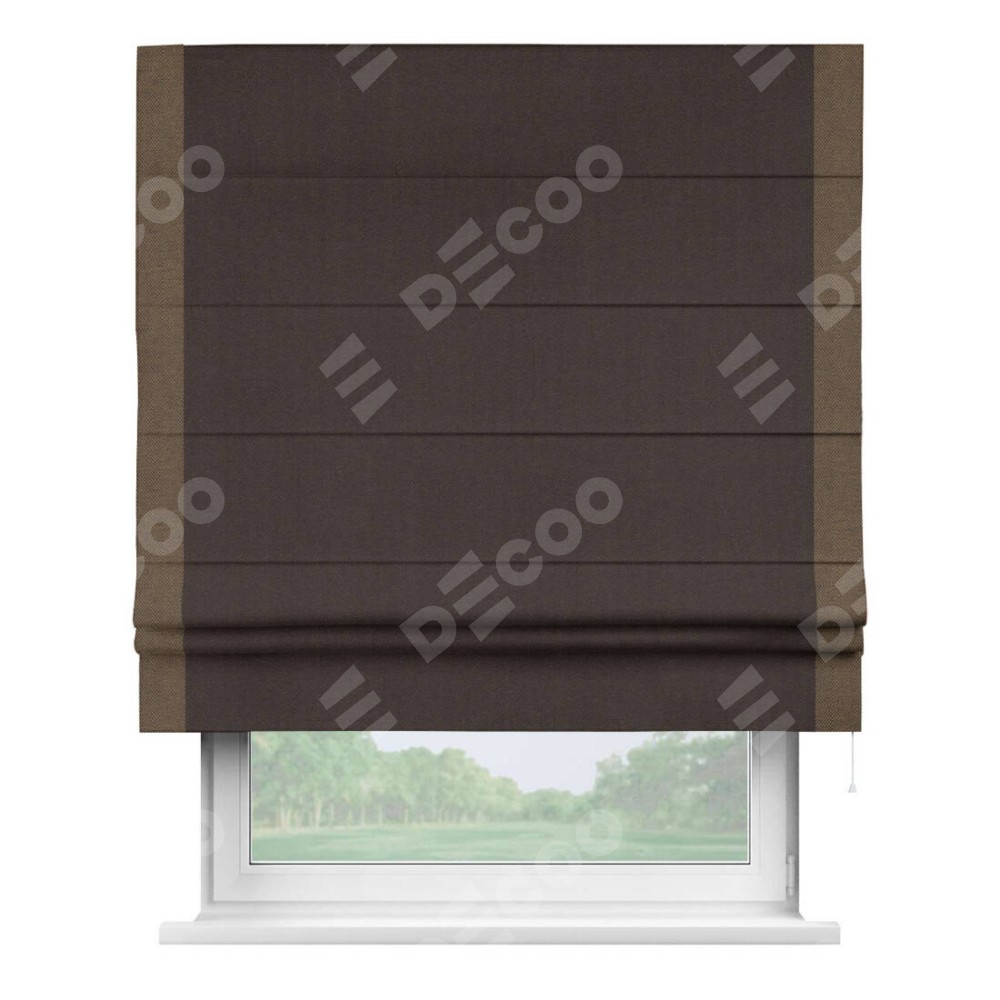 Римская штора пошита из ткани лён димаут венге, артикул: 91001, с отделкой кантом «Стрим Дуо» выделяется наличием кантов по обоим бокам шторы, слева и справа. Этот дизайн придает шторе аккуратный и завершенный вид, акцентируя вертикальные линии и визуально вытягивая окно в высоту. Отделка кантом по бокам не только украшает штору, но и служит практической функцией, укрепляя края и продлевая срок службы изделия.